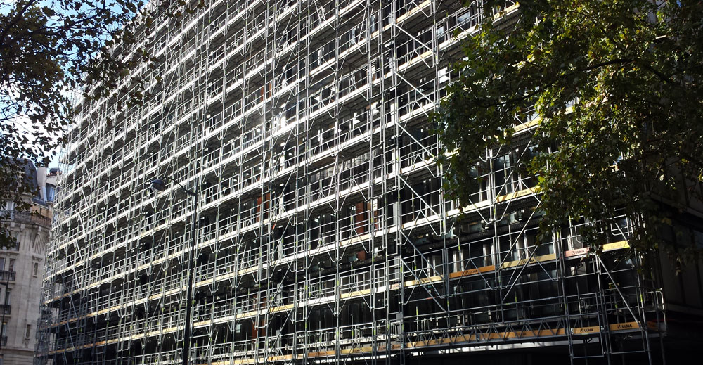 Andamio certificado de fachada formado por elementos tubulares (pies, brazos y diagonales), con una tecnología de unión y montaje rapidísima basado en el disco BRIO.