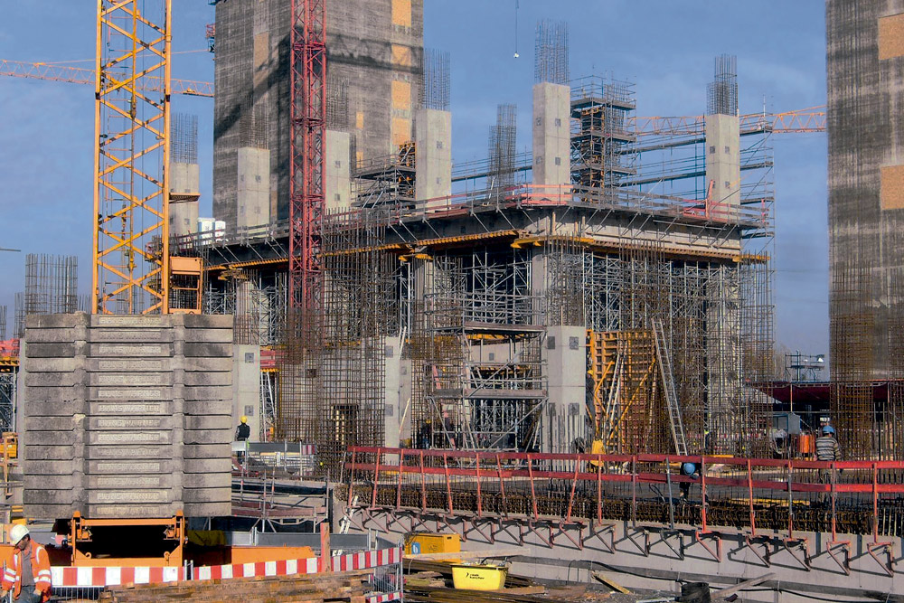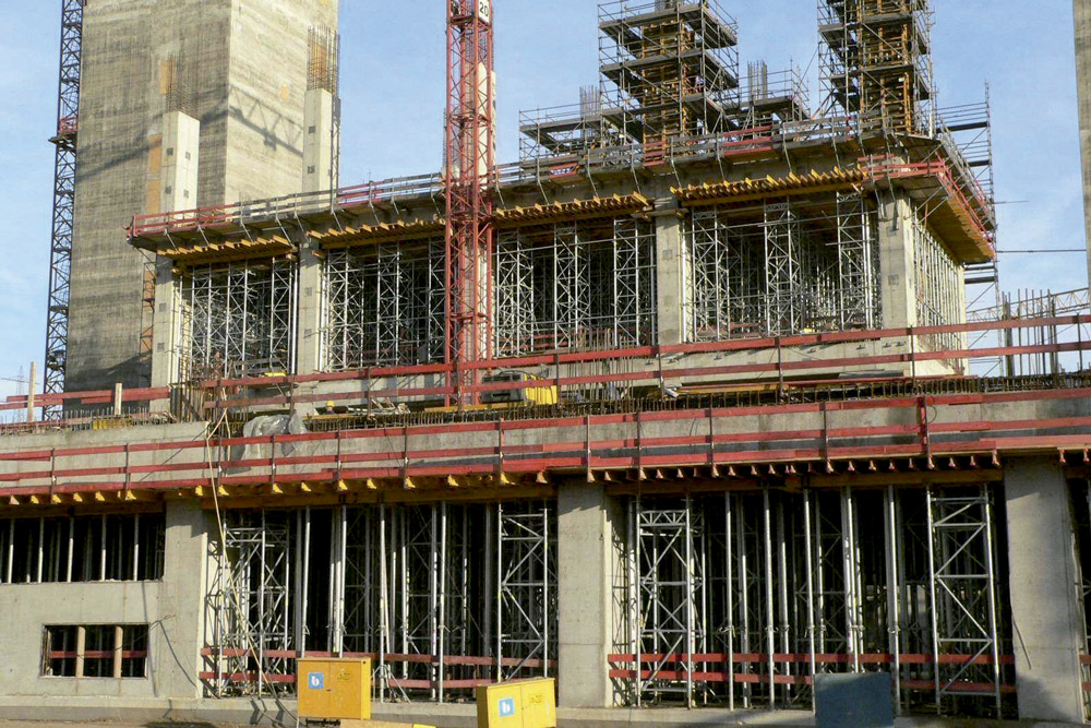 Este edificio de varias plantas, de 100 m longitud, 50 m de ancho y una altura de 43 m, requirió un sistema de zapatas sólidas de 2 m de espesor. Debido a los requisitos estáticos, las columnas, losas y vigas debían tener grandes dimensiones. De ahí que de acuerdo a los tiempos de trabajo reducidos y los consiguientes ciclos de ejecución, se emplease una amplia gama de productos del portafolio en la obra. El proceso de ejecución de tabiques, columnas y demás estructuras fue rápido gracias al empleo de 3.000 m2 de Encofrado Modular ORMA. La amplia gama de paneles posibilitó al cliente seleccionar el adecuado en este caso ya que sus longitudes y anchuras permiten su adaptación a las necesidades de cualquier obra. Además, todos los columnas estuvieron equipados con sus respectivas plataformas de trabajo, garantizando así la seguridad de los operarios en el proceso de hormigonado y en los trabajos en altura.
