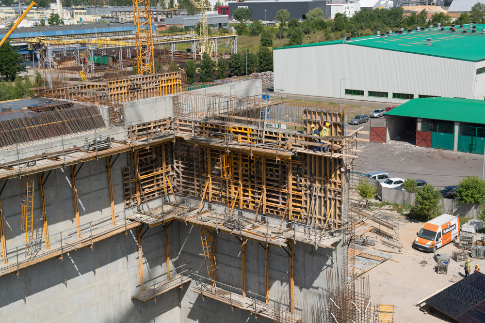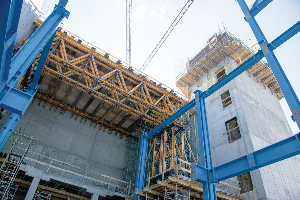 El siguiente paso se ha dado en la zona más baja del edificio: los tabiques de 2,65 m de altura se han realizado con cerchas a una cara SMK y paneles de encofrado de vigas ENKOFORM V-100 de 2,70 m de altura. Mientras, en los tabiques más altos se han empleado consolas de trepado BMK combinadas con conjuntos de encofrado modular ORMA de 5,4 m. Este sistema, por sus rendimientos en costes y tiempos, se ha reutilizado en los tabiques de otras instalaciones.