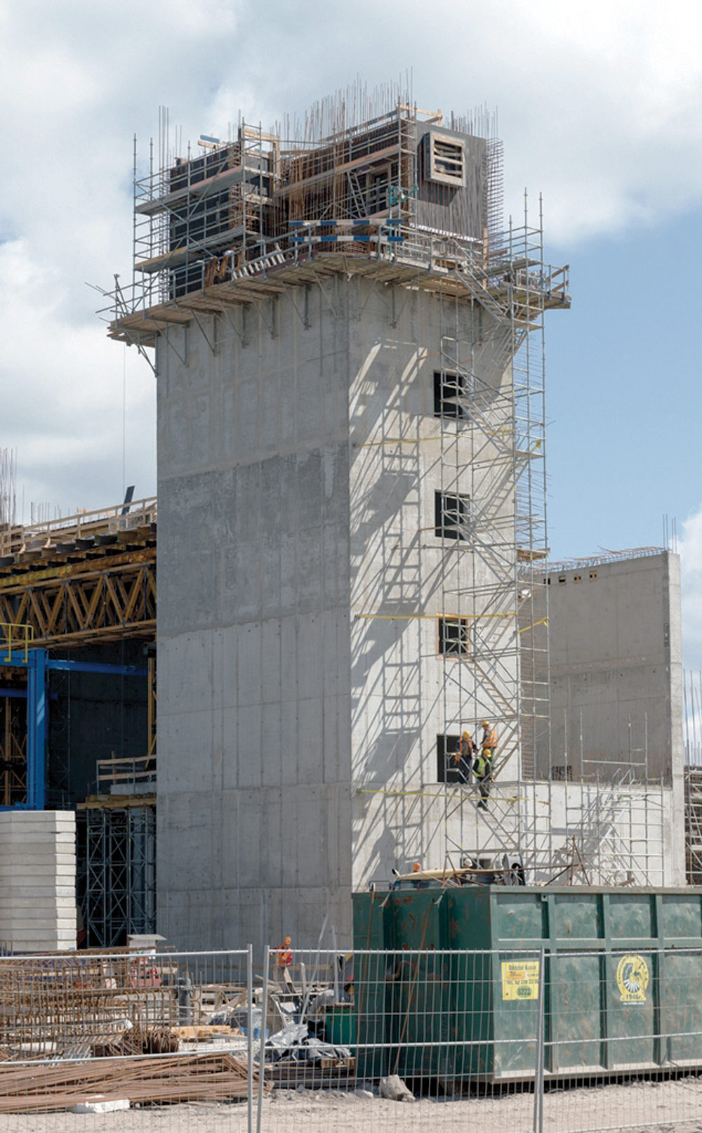 El bunker, la instalación más importante de la planta, tiene 45 m de altura, de los que 12 son subterráneos. Las primeras labores de encofrado se han llevado a cabo en la losa de fundación con paneles ligeros COMAIN.