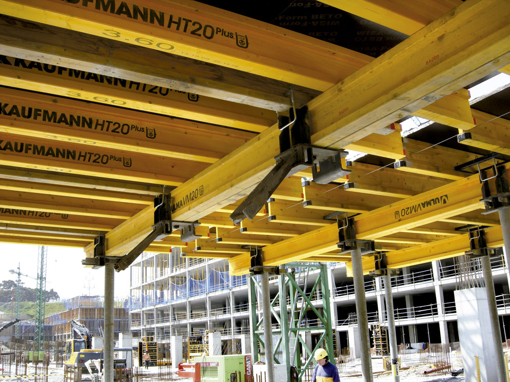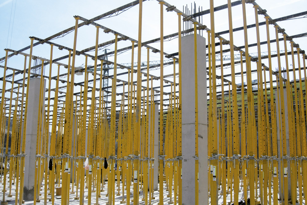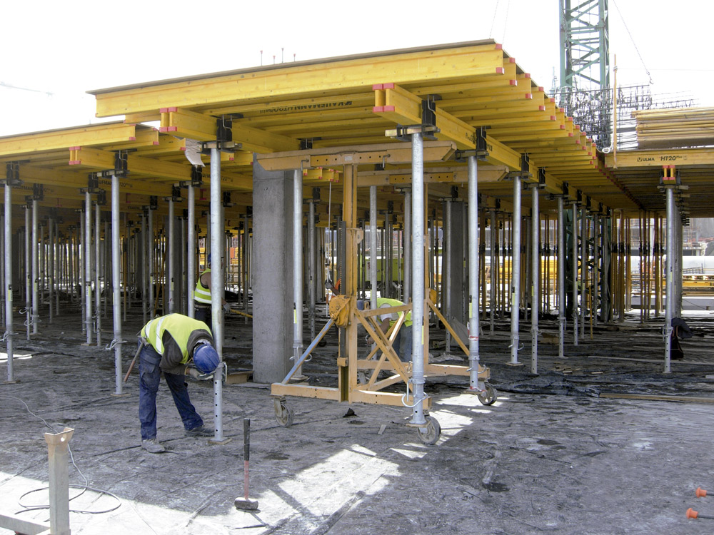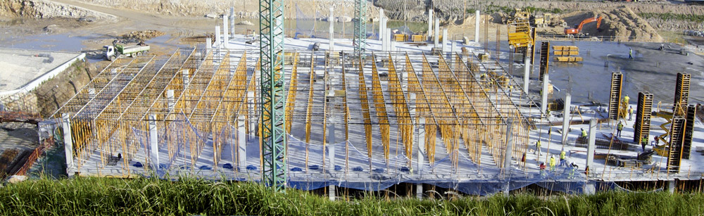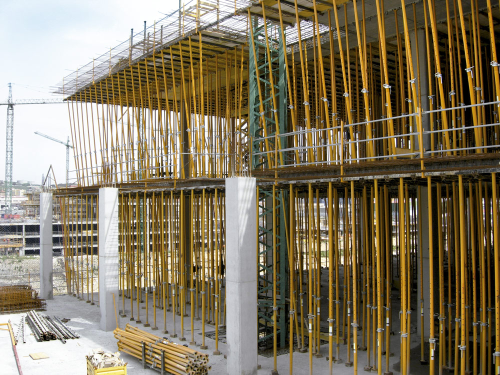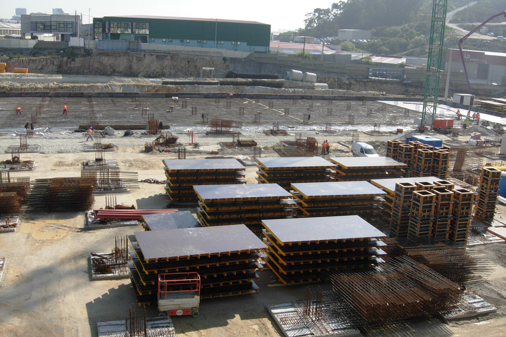 En la ejecución de 450.000 m2 de losa se utilizaron, de acuerdo a las características del proyecto, una combinación entre Mesa VR y Encofrado RAPID sobre cimbra, en alturas considerables, y puntales de aluminio ALUPROP y EP, en alturas intermedias. Estos sistemas aportaron una gran rentabilidad ya que se montaron al inicio de la obra y se trasladaron, sin desmontar, de una zona a otra de la misma. Para el encofrado de los tabiques y columnas de hormigón se utilizó el sistema modular ORMA.