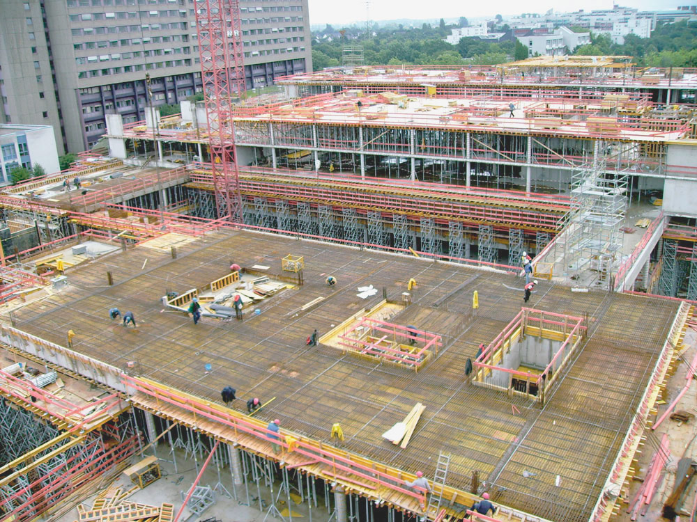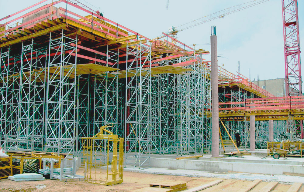 Los forjados se ejecutaron con 68.000 m de Vigas de madera VM 20 y con 11.600 unidades de Puntal EP. Los tabiques se realizaron con Encofrado Modular ORMA por cuyas características técnicas la obra se ha ejecutado a un ritmo eficaz. La amplia gama de alturas y anchuras proporcionó adaptaciones particulares a las exigencias de la obra. Estas cualidades permitieron un rápido avance, porque una vez montadas las unidades, y fijadas mediante grapas, se trasladaron en conjuntos de paneles con grúa.