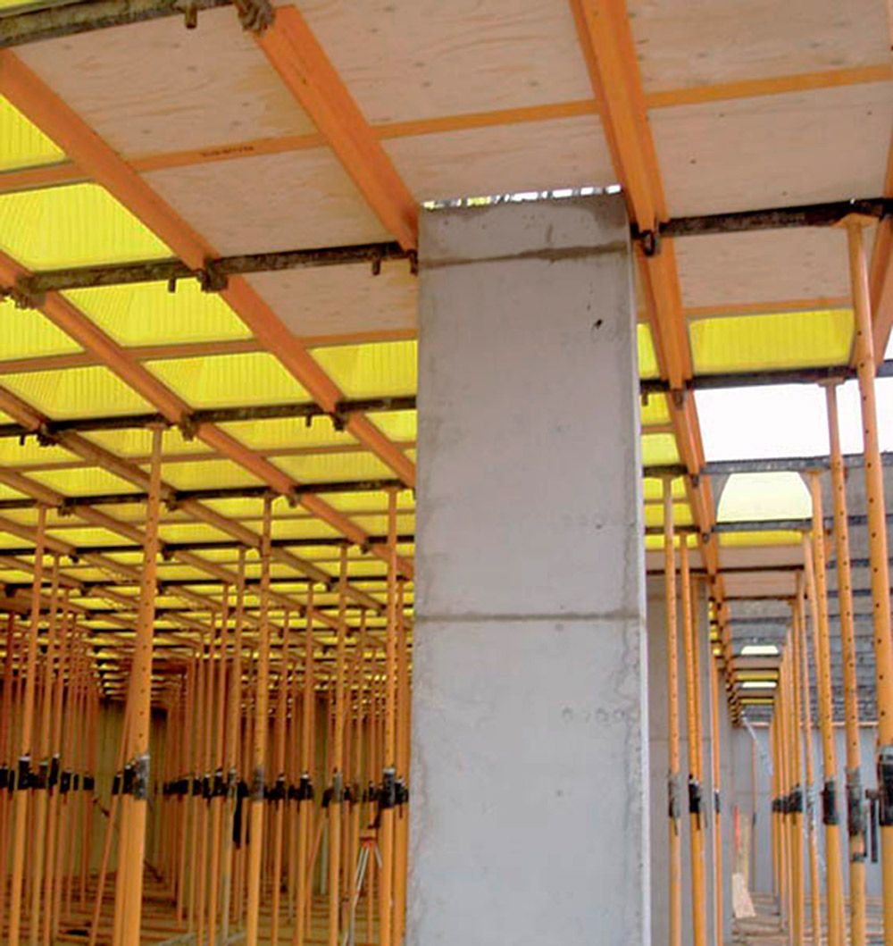 En la ejecución de los más de 26.000 m2 de losas aligeradas del edificio se utilizó el sistema RECUB. El diseño de sus componentes posibilitó que, en menos de 72 horas tras su hormigonado, se pudiera disponer de estos elementos para una nueva puesta. Este producto permite una mayor luz entre columnas, por lo que se reduce su número y aumenta el aprovechamiento del espacio. Además admite una distribución libre y estratégica de las columnas con lo que proporciona una gran flexibilidad para resolver proyectos que requieran espacios diáfanos como este hospital. El apeo de este encofrado se solucionó con Puntales SP responsables de transmitir las cargas de las losas.