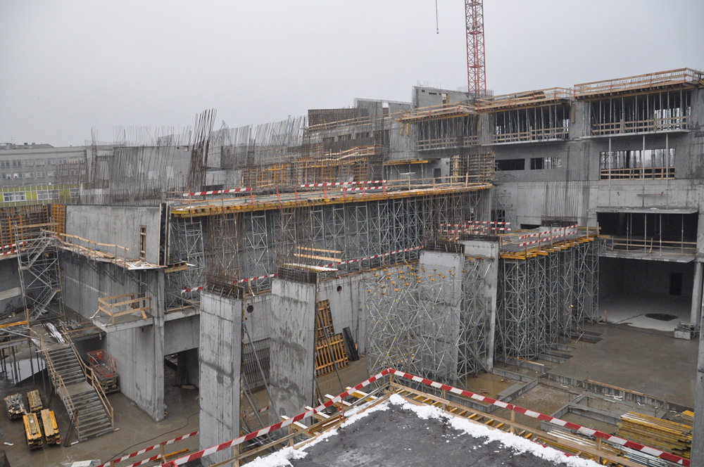 Ante una inclinación de 6,5º y tabiques exteriores de gran altura, ULMA apostó por una solución única: un encofrado modular vertical, para tongadas de 8 m, y plataformas de trabajo que garantizaban la seguridad laboral.