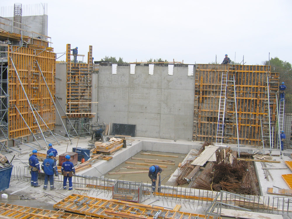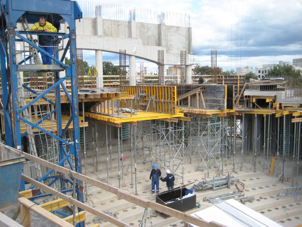 Los tabiques del salón principal, la zona de mayor altura de todo el edificio, se llevaron a cabo en ciclos de hormigonado de 6,6 m de alto, con el empleo de paneles de 2 x 3,3 m, de encofrado modular. En todo momento se utilizaron plataformas de trabajo y de hormigonado que garantizaron la seguridad de los trabajadores durante toda la obra.