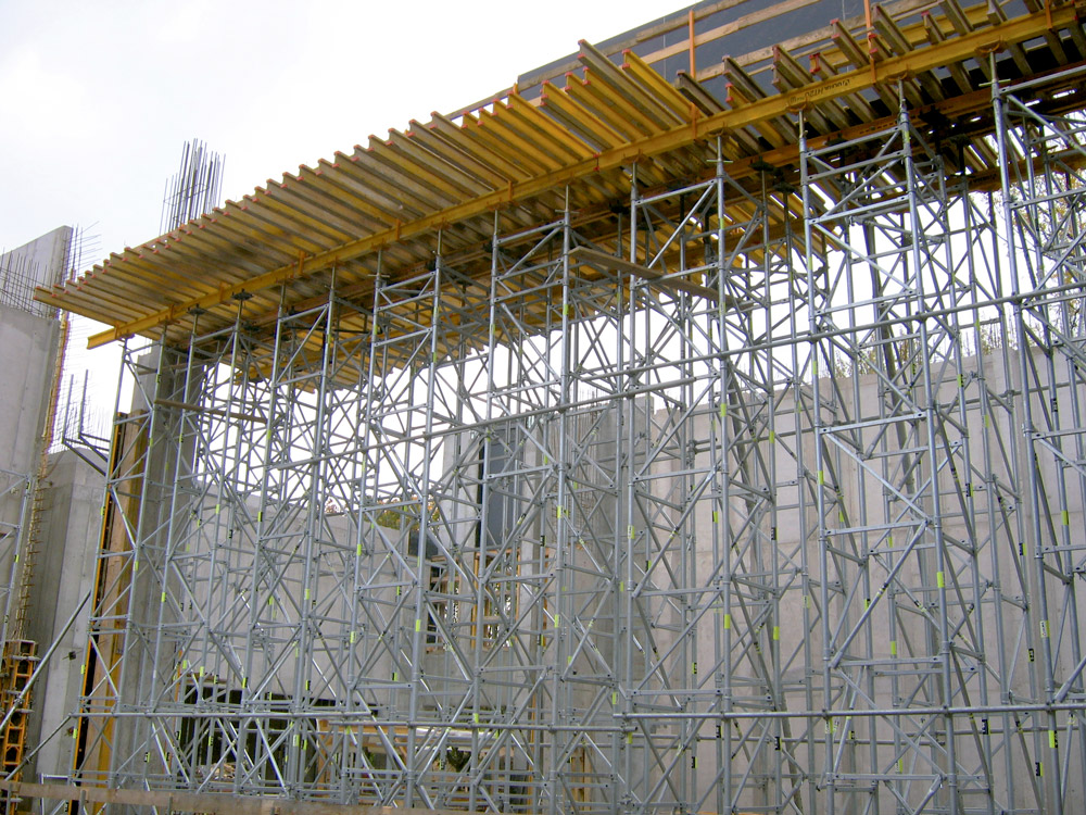El reto fue la ejecución, en una sola fase, de tabiques de 10 m y columnas de 15 m de altura de hormigón visto, sobre los que se realizaron vigas horizontales de hormigón. En la construcción de estas vigas, se utilizaron torres T-60 de 11 m de altura y encofrados verticales modulares.