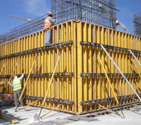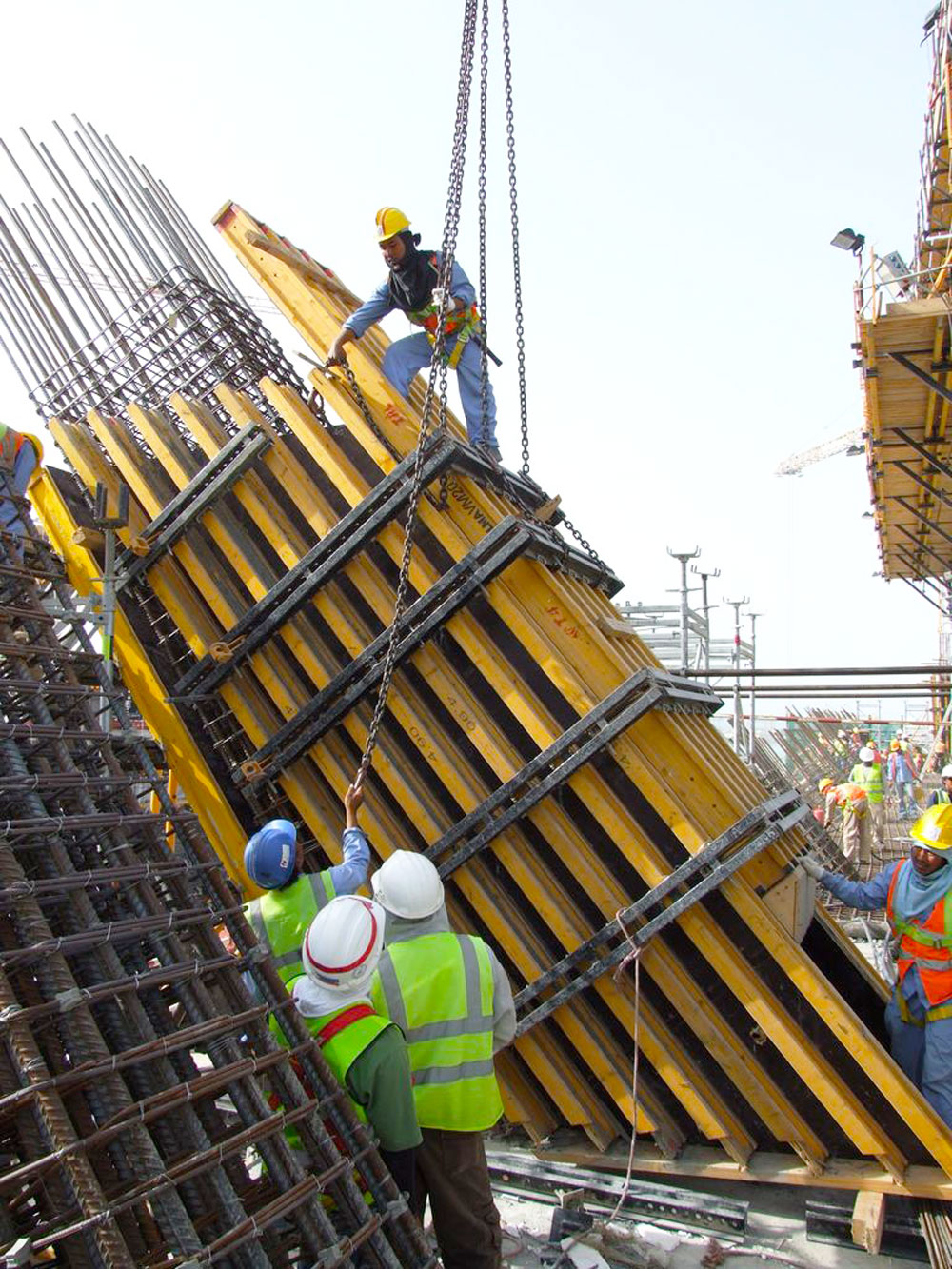 Los tabiques de apoyo e inclinados, de forma variable, además de las estructuras de núcleo se ejecutaron de manera rentable con el Encofrado Vertical ENKOFORM V-100. Este sistema solucionó la ejecución de varias estructuras, con diferentes geometrías, consiguiendo altos rendimientos y excelentes acabados. Con sus piezas estándares, riostras metálicas y vigas de madera, se realizaron paneles a medida obteniendo las configuraciones complejas del proyecto.