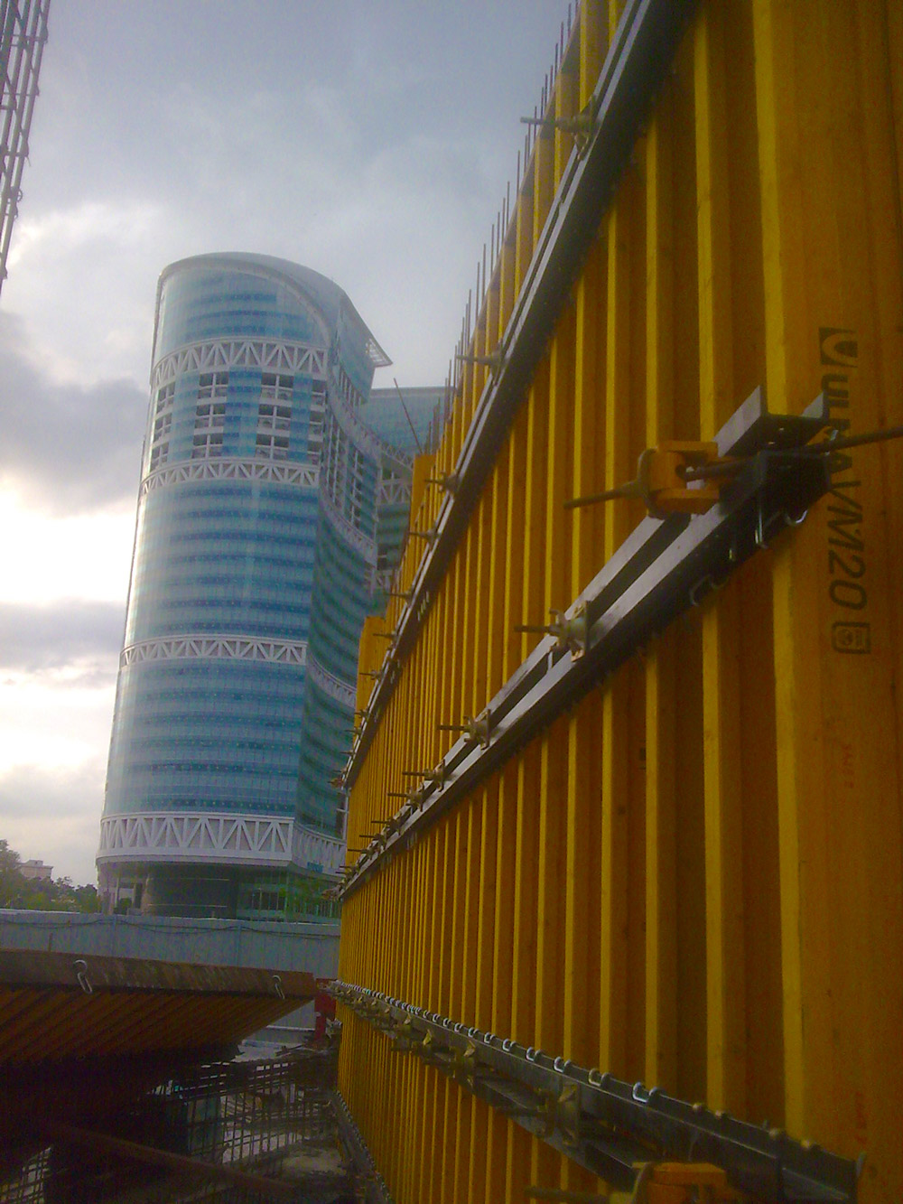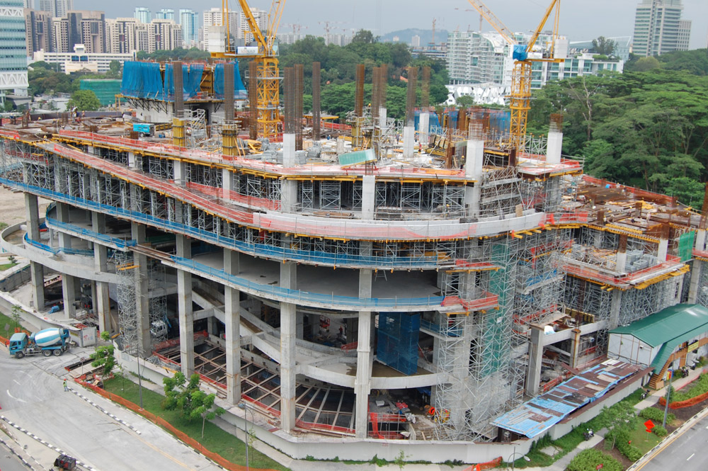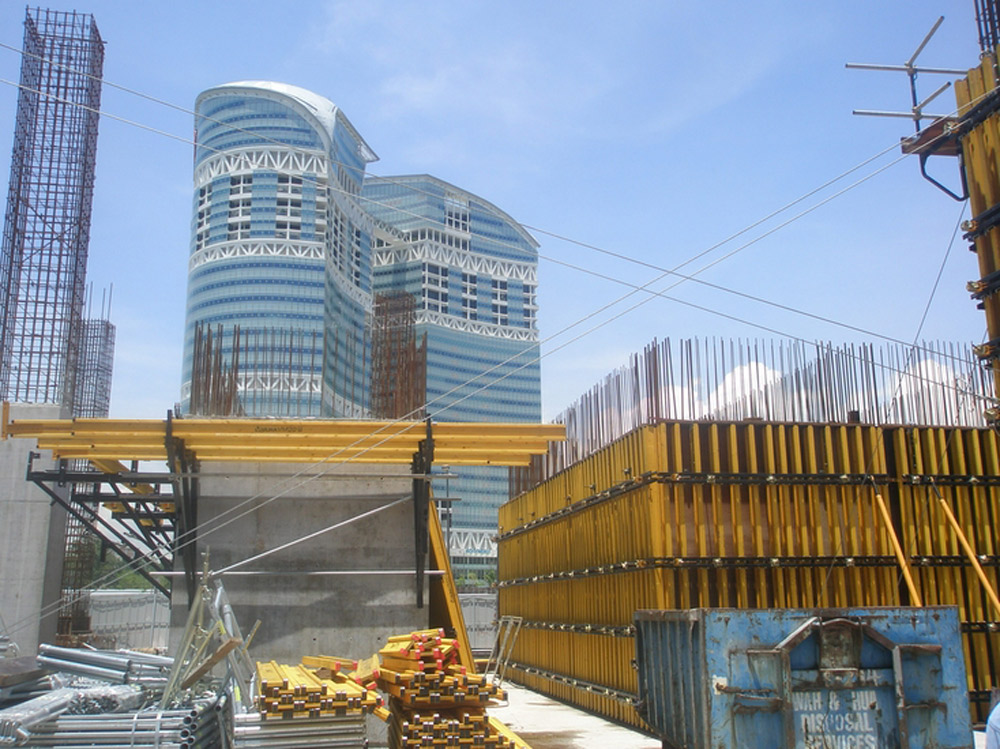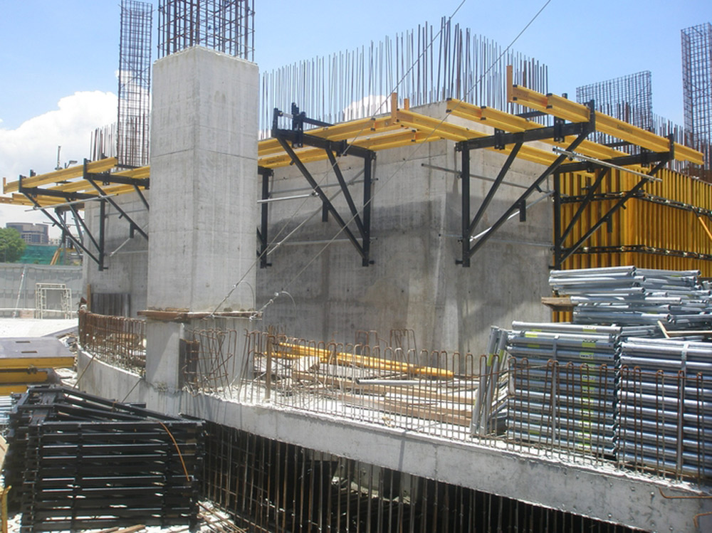 Al tratarse de una geometría de obra un tanto compleja, los tabiques y columnas se ejecutaron con el Encofrado Vertical ENKOFORM V-100 y Consolas de trepado CM-220. Este sistema de riostras está formado por elementos estándares, principalmente por riostras metálicas y vigas de madera que soportan el tablero, conformando paneles a medida en función de las características requeridas.