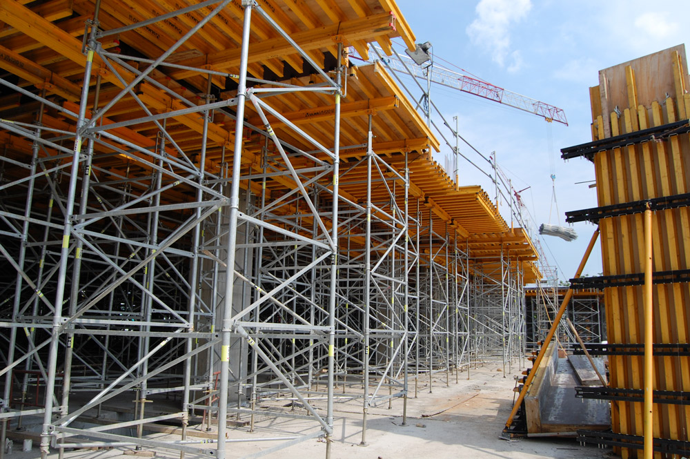 Las losas y vigas de cuelgue en el piso tipo se ejecutaron con Mesas VR y Puntales EP, cuya gama permitió adecuarse a las alturas de cada planta. Este encofrado horizontal fue el idóneo para todas las losas y facilitó un rápido montaje y mínimo consumo de tiempos en los movimientos horizontales y verticales de obra. Asimismo, en las tres primeras plantas, de 11 m cada una, se emplearon Mesas VR con T-60 y Encofrado Horizontal de Vigas de madera ENKOFLEX.