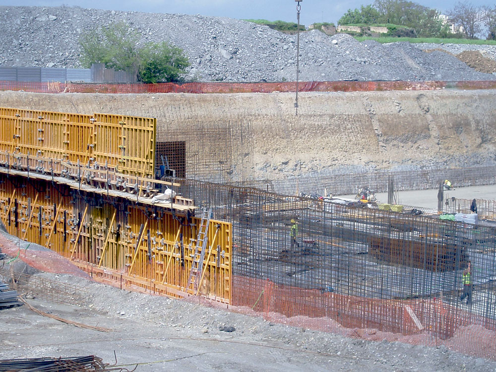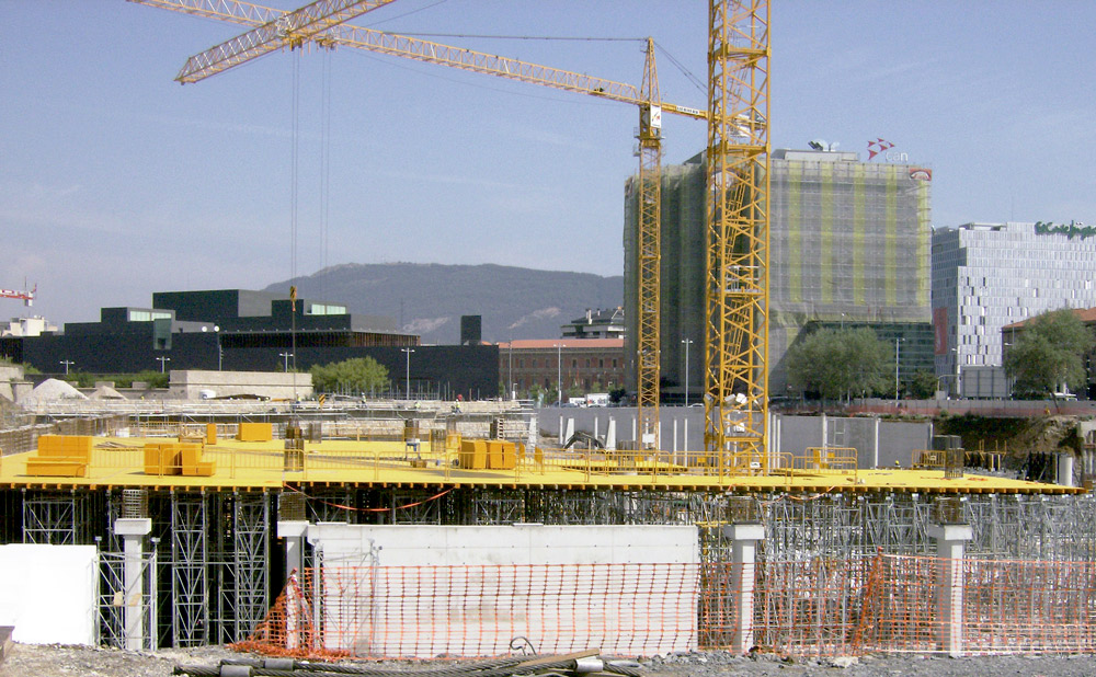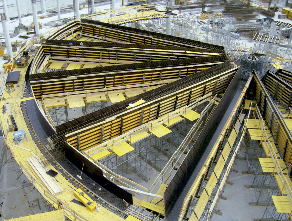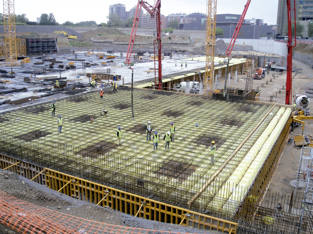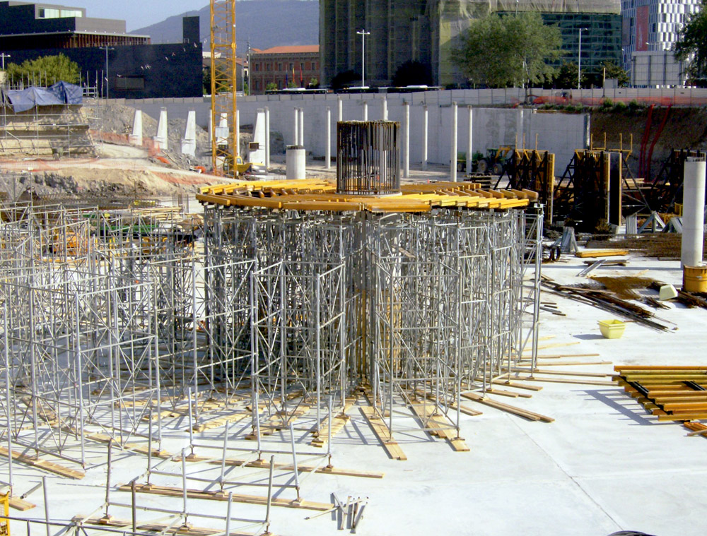 En la ejecución de tabiques se utilizó Encofrado Modular ORMA consiguiendo en todos los casos un perfecto acabado de hormigón visto. Cuando no fue posible emplear paneles enfrentados, por las características del entorno, se emplearon sistemas de encofrado a una cara para resistir la presión del hormigón. Las múltiples geometrías de columnas se solucionaron con Encofrado Circular CLR, los cilíndricos y con ENKOFLEX y ORMA, aquellos que disponían de capiteles, etc.