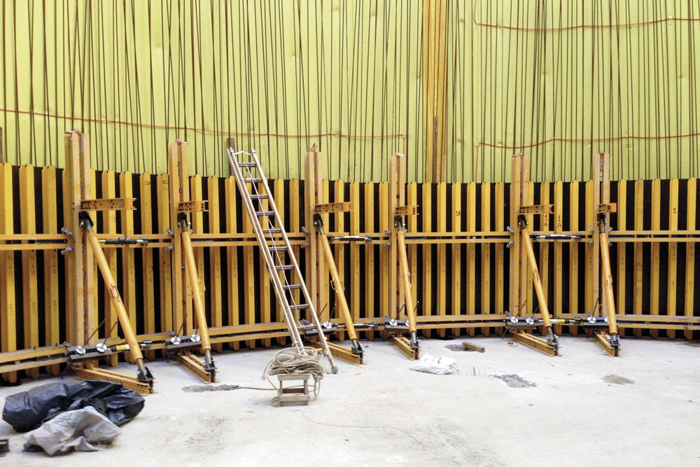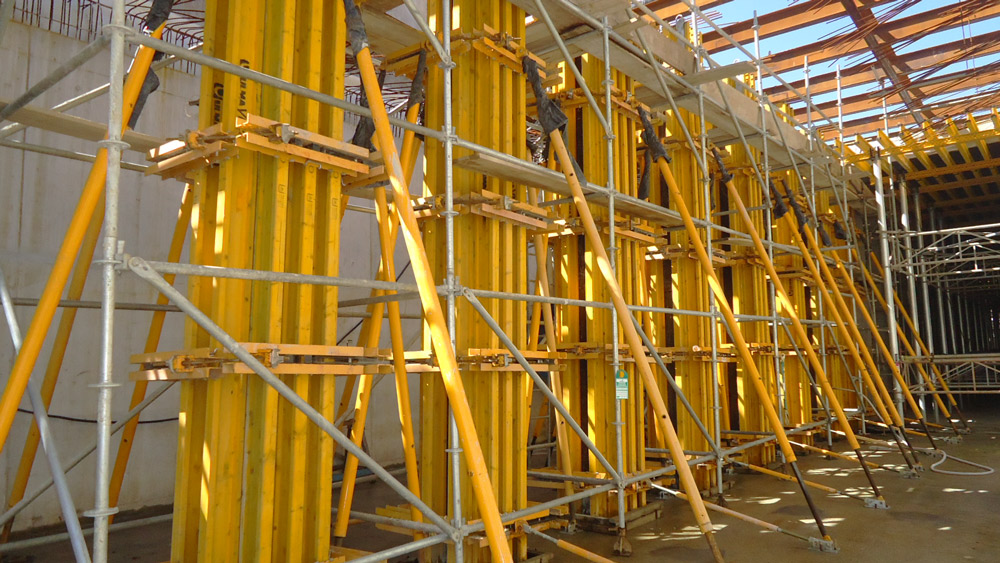 Los tabiques laterales a una cara de 5,7 m se han realizado con Encofrado Modular ORMA y cerchas que se han trasladado con carros de una puesta a otra sin la necesidad de ser desmontadas. Por razones de ejecución, se han llevado a cabo en dos fases, la primera con cerchas SMK y la segunda con consolas de trepado a una cara SBF.