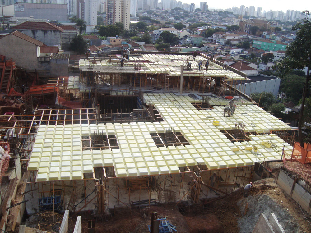 Las losas de los cuatro sótanos (más de 6.000 m2) se ejecutaron de forma rápida y segura con el sistema recuperable para losas nervadas RECUB, con cubeta de 20 cm y 5 cm de capa de compresión. En losas convencionales, se empleó el encofrado BTM, con ciclos de hormigonado semanales.