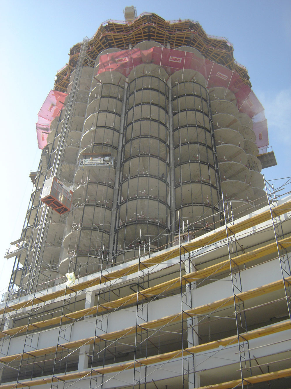 Dada la particular geometría de las torres, con salientes curvilíneos, se empleó en la ejecución de las losas el sistema ENKOFLEX con Puntal EP. Al estar formado por vigas independientes, este producto posee gran versatilidad por lo que se adaptó a la perfección a la fachada con formas ovaladas.
