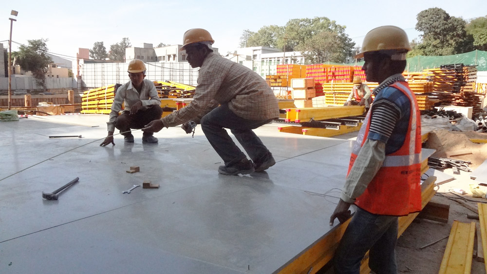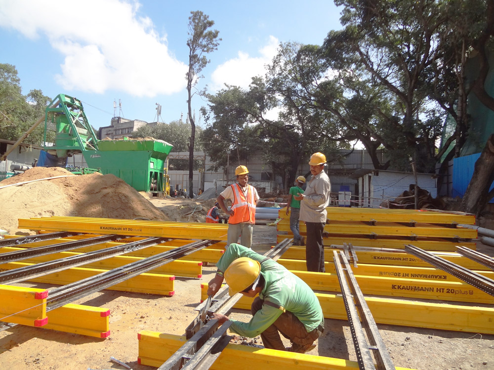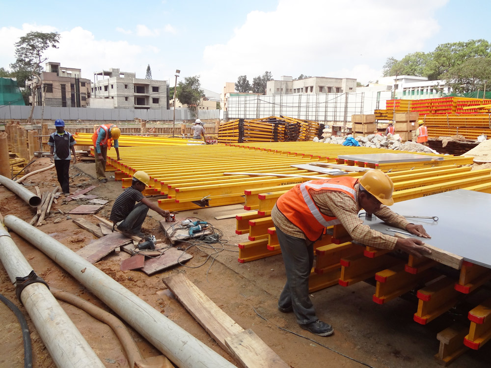 El núcleo central fue construyéndose en todo momento uno o dos niveles por encima de las losas. El encofrado ENKOFORM V-100 se combinó con el sistema de trepado BMK en la cara exterior de los tabiques y plataformas interiores KSP en las caras internas. El ciclo de hormigonado por planta se calculó en 9 días.