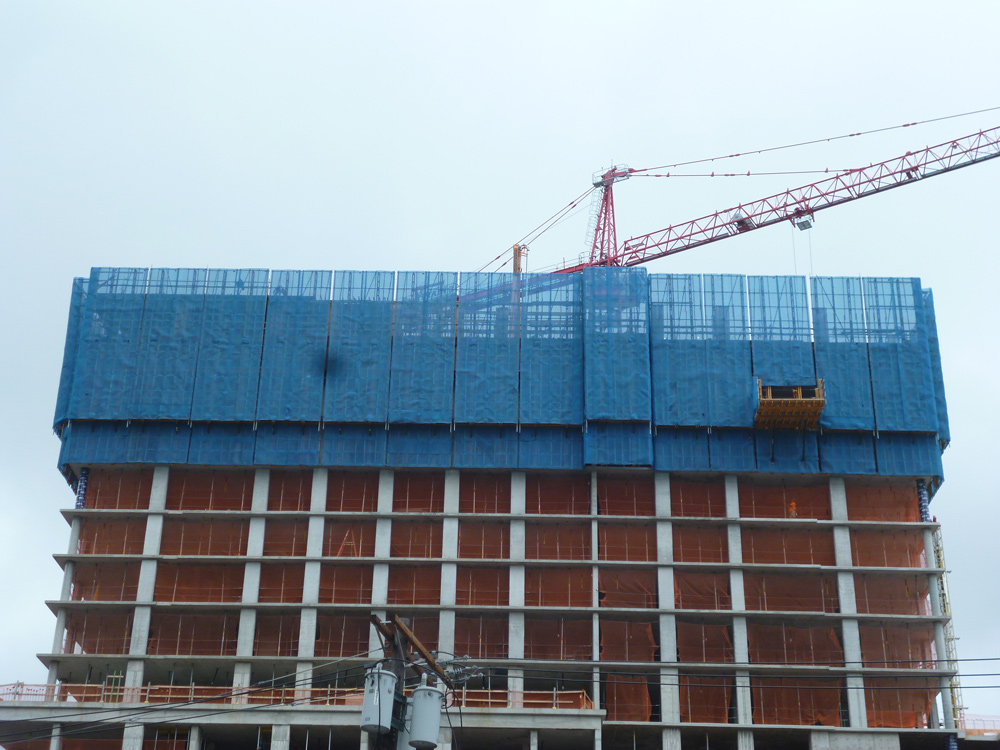 Para garantizar un espacio de trabajo seguro, se ha cubierto el perímetro del edificio con la protección autotrepante HWS. Son paneles que envuelven la planta en ejecución y tres plantas inferiores y que se elevan de manera hidráulica, a medida que se crece en altura.