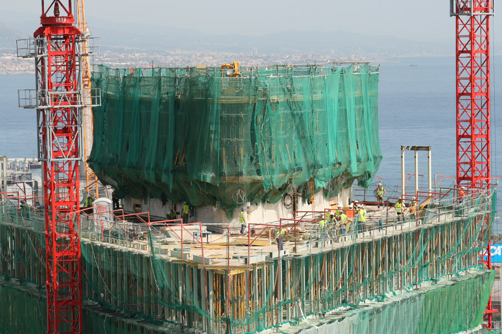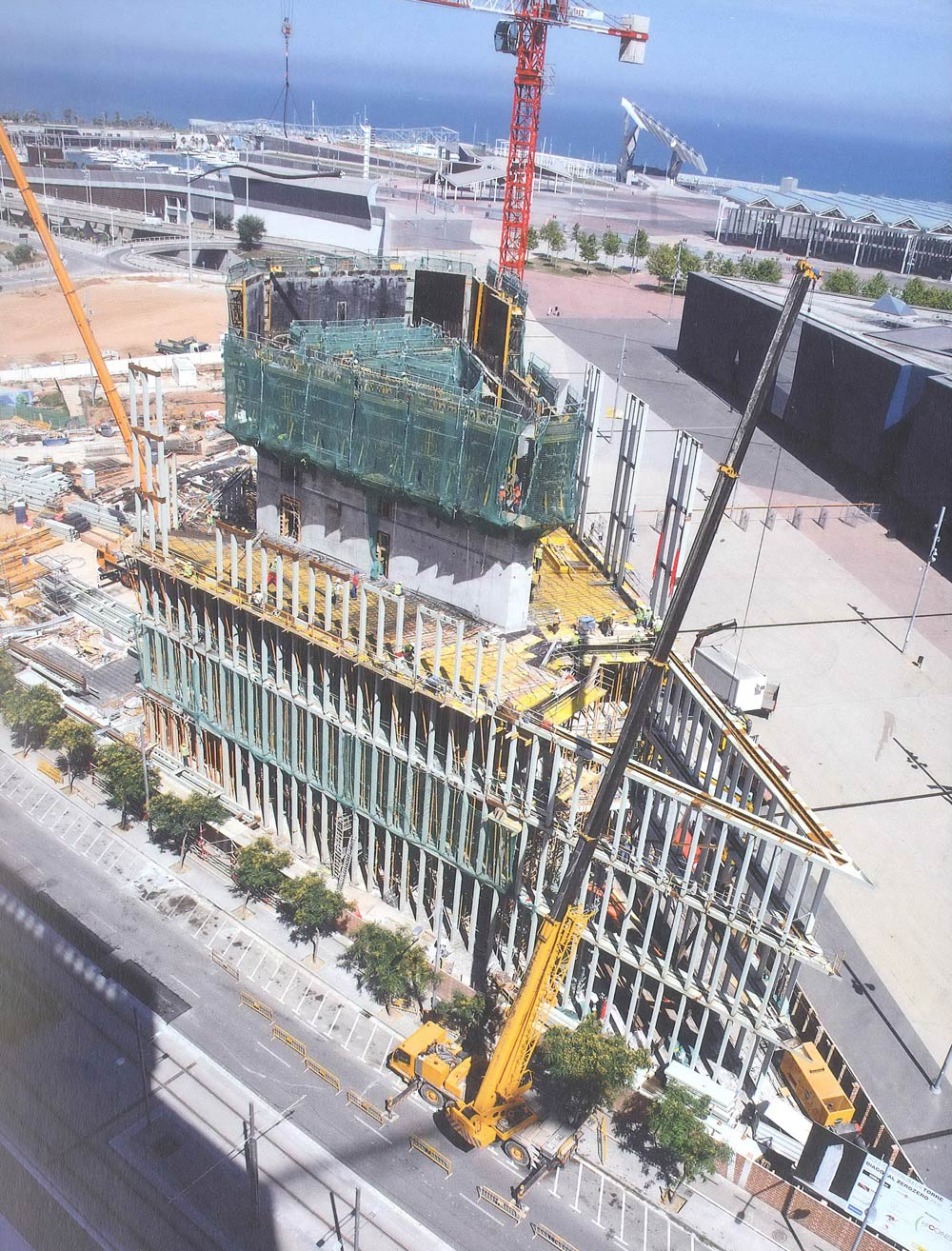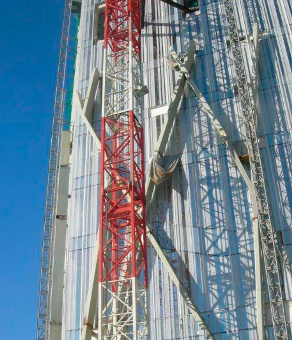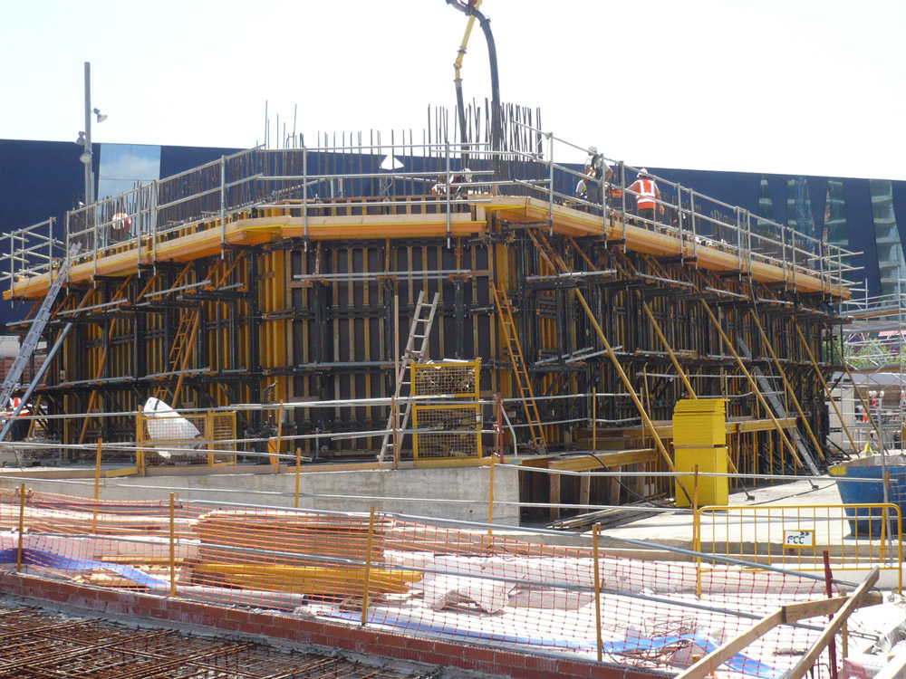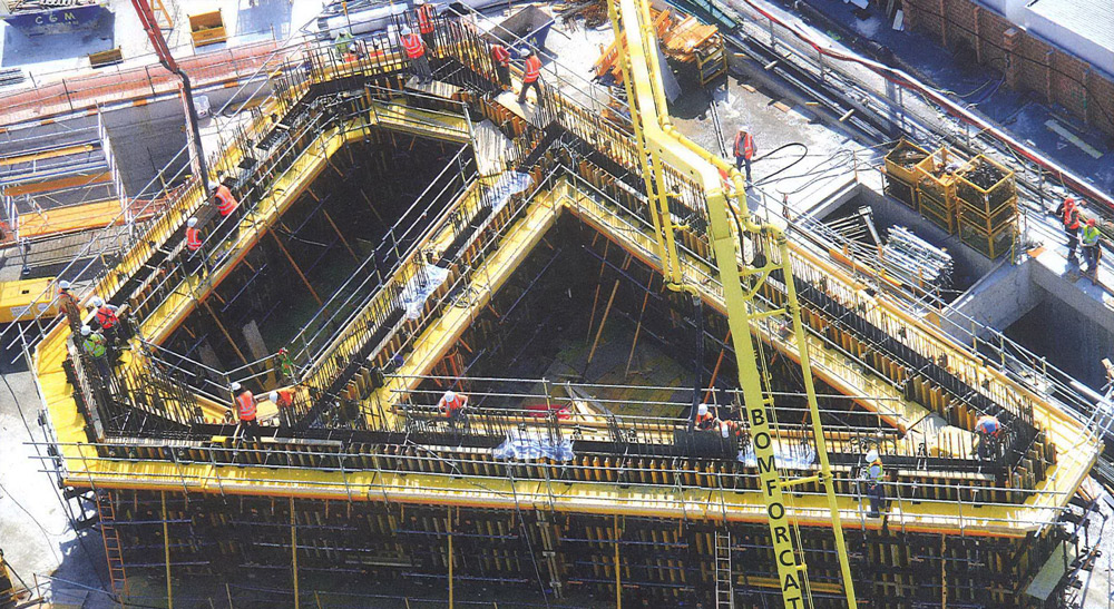 El núcleo central se ha ejecutado dos plantas por delante de los forjados, mediante trepado con Consola 2000 y ENKOFORM V-100. Gran parte de las losas se construyeron con el encofrado horizontal RAPID y, en algún caso, con ENKOFLEX.