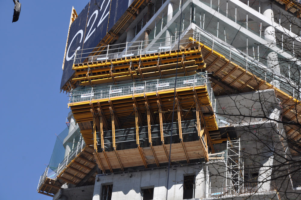 En los dos primeros núcleos, se han empleado plataformas autotrepantes ATR-P dentro de una solución trepante estándar. Esta solución ha incluido tres plataformas de trabajo, y una estructura portante para el encofrado modular ORMA.
