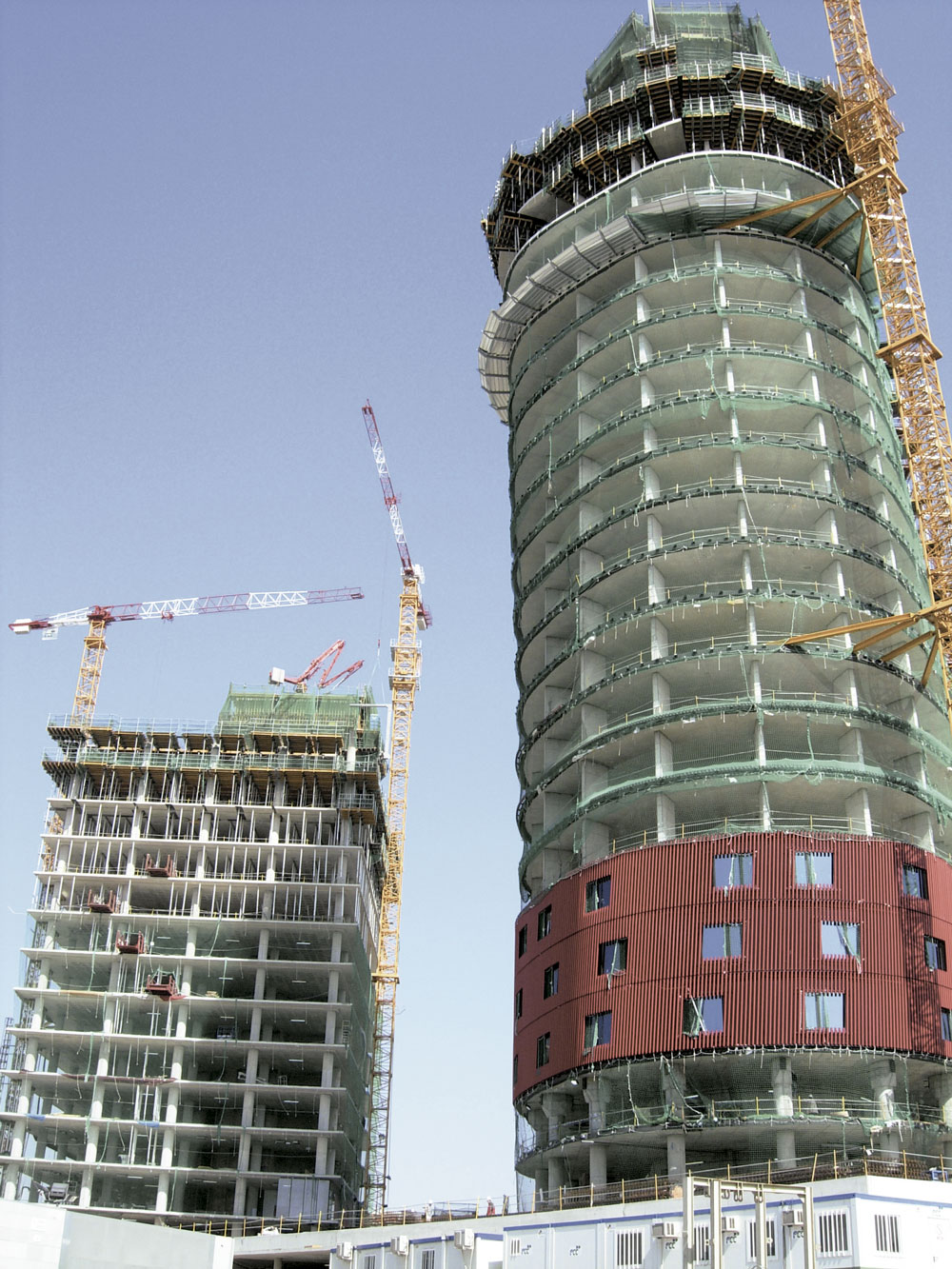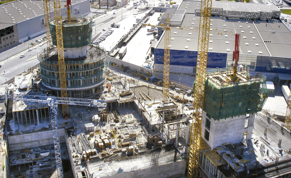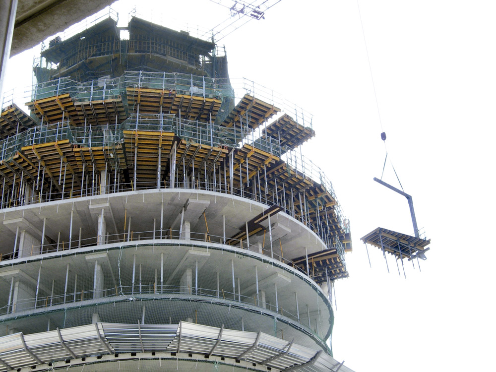 Las peculiares siluetas de ambos edificios precisaron de núcleos de hormigón particulares. El núcleo del edificio del hotel, de geometría cilíndrica y un diámetro de 13 m y espesor de tabique de 40 cm, se solucionó con una plataforma interior y consolas exteriores, ambas autotrepantes. Además, el efecto de rotación se consiguió con la variación de la superficie de una planta a otra, de 700 a 1.000 m2. Mientras que la geometría rectangular del edificio de oficinas, con un espesor de tabique de 45 cm, se solucionó con tres plataformas interiores y consolas exteriores ambas autotrepantes.