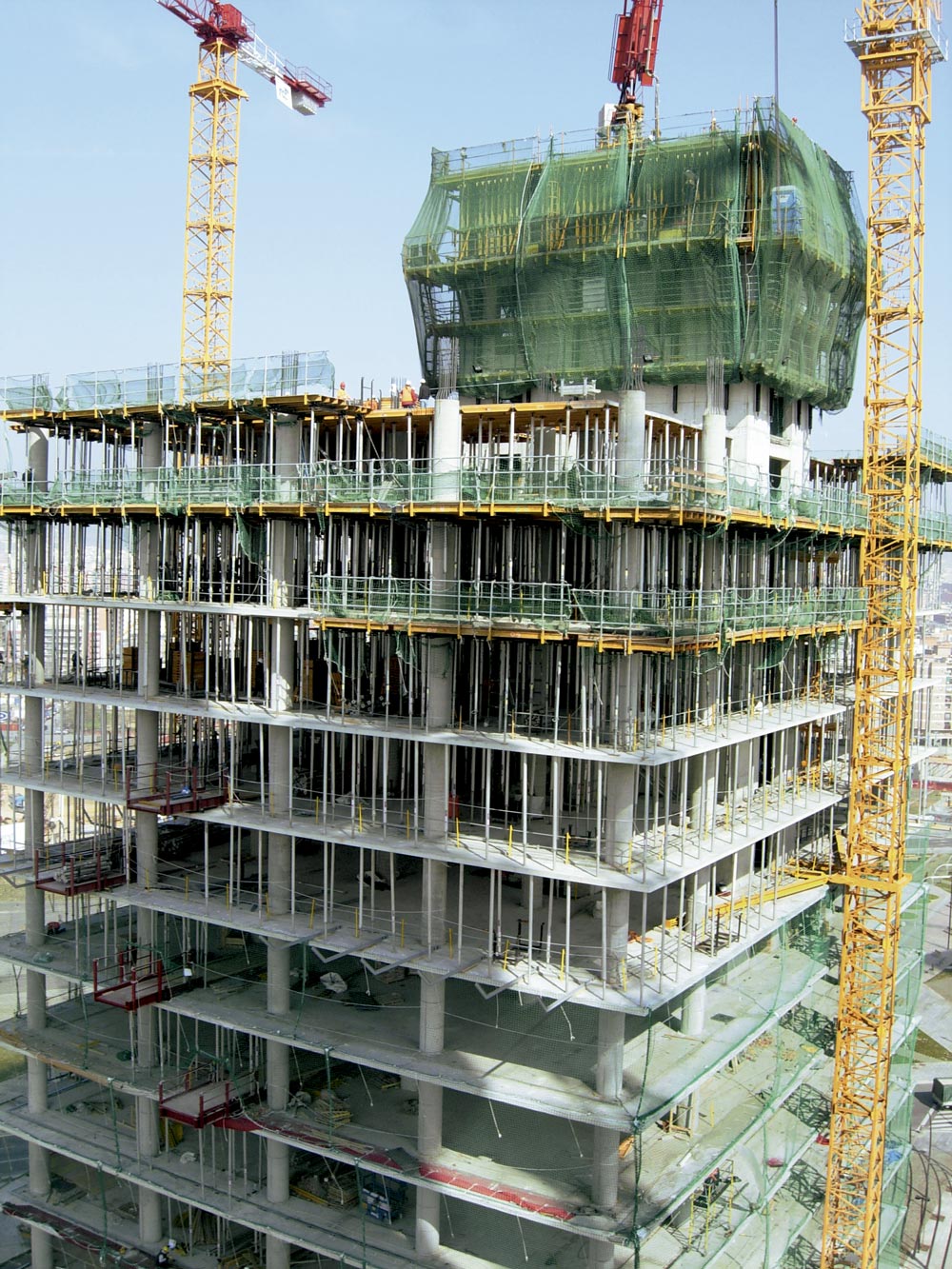 Así, en la ejecución de núcleos de hormigón fue posible elevar el encofrado en condiciones climáticas adversas. La productividad o rentabilidad del sistema siempre estuvo asegurada ya que el ritmo de ejecución, en este caso, fue de una planta completa, de 700-1.300 m2, cada 6 ó 7 días. La técnica del autotrepado se basa en un sistema hidráulico que permite llevar a cabo la elevación del conjunto de manera automática y simultánea mediante el movimiento sucesivo del encofrado y los mástiles. Este sistema, utilizado junto con el ENKOFORM V-100, permitió la ejecución de tabiques con una altura típica entre losas de 3,84 m en el hotel y 4,14 m en el edificio de oficinas.