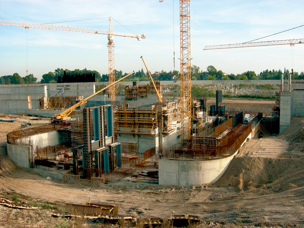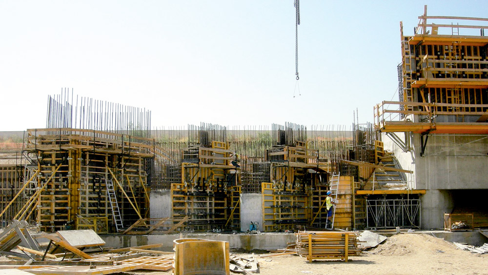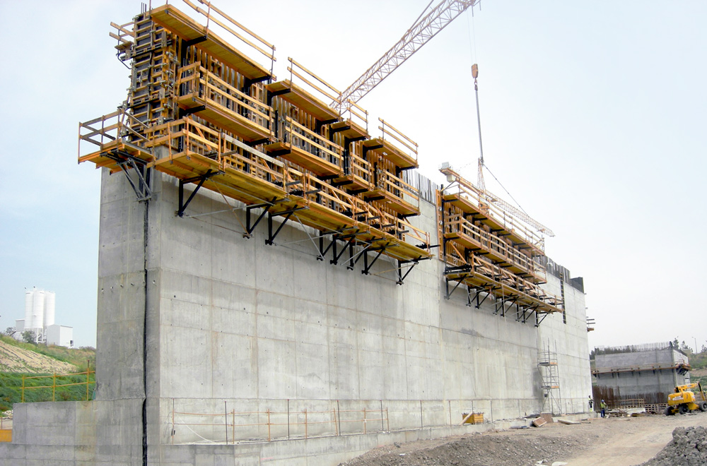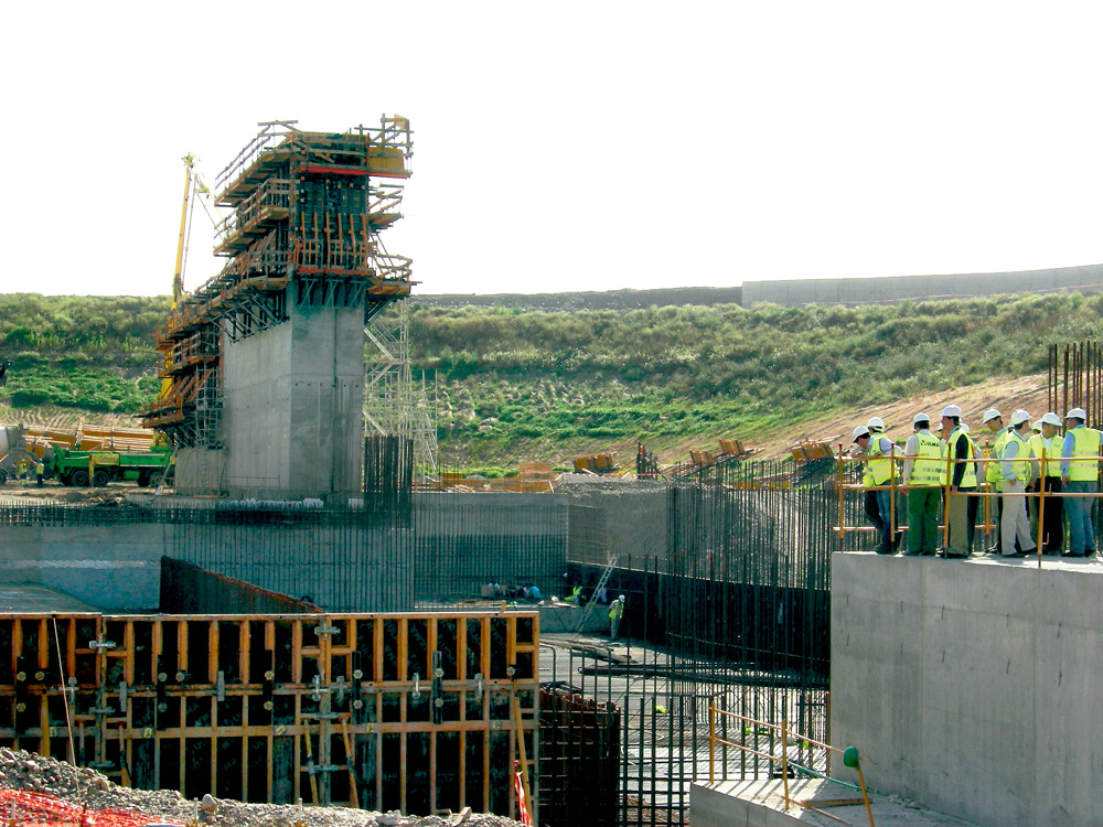 Las pantallas, los difusores, los contrafuertes, los garajes y contragarajes se realizaron con consolas de trepado y Encofrado ORMA. Esta solución, por su rápido montaje, fue la óptima para este tipo de estructuras. Además, en estas mismas zonas, se diseñaron velas especiales para hacer trepados a una cara de 4,5 m, con presiones de hormigonado controladas. Las galerías de los canales, así como los difusores se ejecutaron con cimbras y Encofrado Horizontal ENKOFORM HMK, con espesores de losa de hasta 2 m.