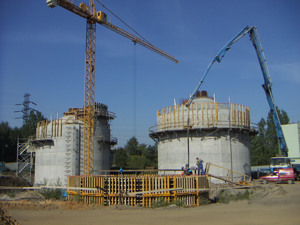 Consistieron en 3 estructuras radiales de 20 m de diámetro y 5,5 m de altura. La demanda de un hormigón de alta calidad supuso el empleo de un encofrado de vigas que permitió adecuarse a las particulares formas de los depósitos. Los tanques de sedimentación, ejecutados con módulos de paneles de 1/8 de circunferencia, se reutilizaron con las correspondientes compensaciones logrando los acabados deseados.