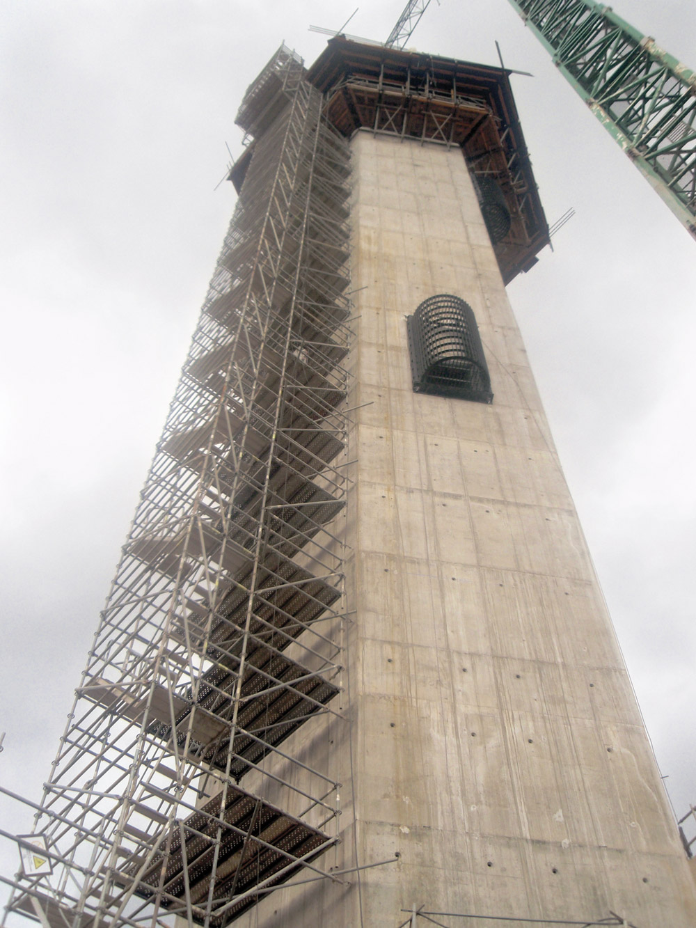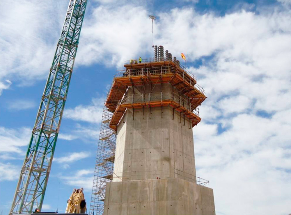 La torre de toma, que junto con la cámara de válvulas alcanza una altura de 90 metros, se ha ejecutado con trepados de 2 metros de altura mediante la Consola 2000 y el encofrado de vigas de madera ENKOFORM V-100 en los tabiques rectos. Para los tabiques de la zona superior de la torre, que en sus últimos 10 metros de altura tiene una geometría cilíndrica de 13,5 metros de diámetro, se ha utilizado el encofrado circular FLECTOR.