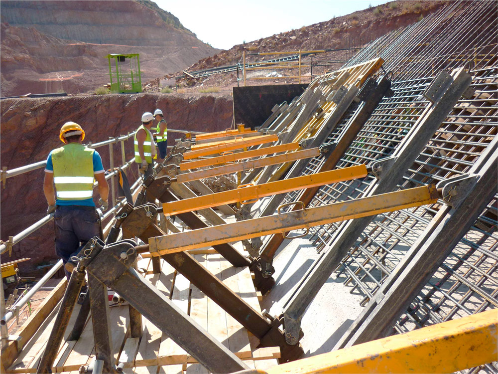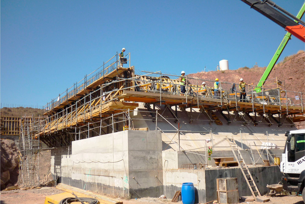La cámara de válvulas de 55 metros de anchura se ha realizado mayoritariamente con el Encofrado modular ORMA, con la Consola de trepado 2000 y con las cerchas UCAB-EUC. En las losas de poco espesor se ha utilizado el encofrado de losa RAPID y el encofrado de vigas ENKOFLEX y en las losas de mayor potencia, en cambio, (espesor mayores de 70 cm.) el encofrado de losa ENKOFORM H-120.