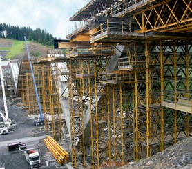 Para la ejecución de las pilas se emplearon los mismos productos en el mismo proceso, en los tres casos: encofrados con riostras, y vigas sobre Estructuras H-33, con longitud suficiente para el hormigonado de ambas fases, 35 m de longitud. Mientras, los paños de encofrado de Vigas HM-500 se conformaron con tablero fenólico, vigas y riostras, todo el conjunto apoyado sobre Estructuras H-33, colocadas a 0,5 m entre cada una. La unión entre los paños se efectuó con Barras DW. La transmisión de cargas de estas pilas al terreno se realizó mediante dos grupos de torres T-500. Además, se transmitieron cargas al plinto de la pila mediante perfiles con barras de atado y cuñas de desencofrado.