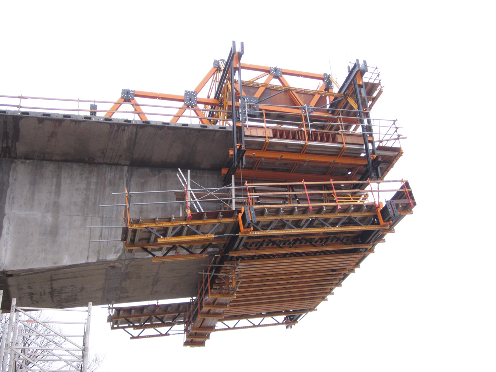 Las pilas de 15 a 18 m de altura se realizaron con encofrado ORMA, combinado con la Consola de trepado CR-250. En un solo movimiento de grúa, cada conjunto se iza a la siguiente puesta junto con sus amplias plataformas.