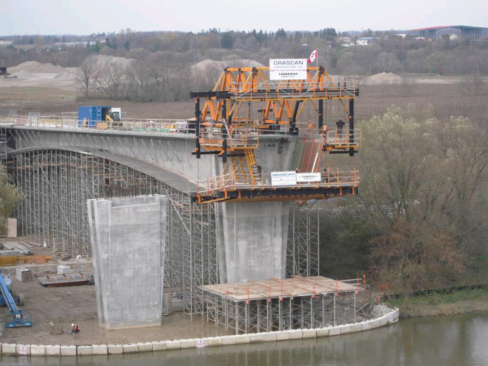 Este vano, levantado mediante dovelas sucesivas in situ, convierte a este puente en el primero construido en Ontario con esta técnica desde los años 80. ULMA puso al servicio del cliente el sistema más avanzado y los especialistas más cualificados en su aplicación, idóneo en orografías accidentadas, más comunes en Europa.