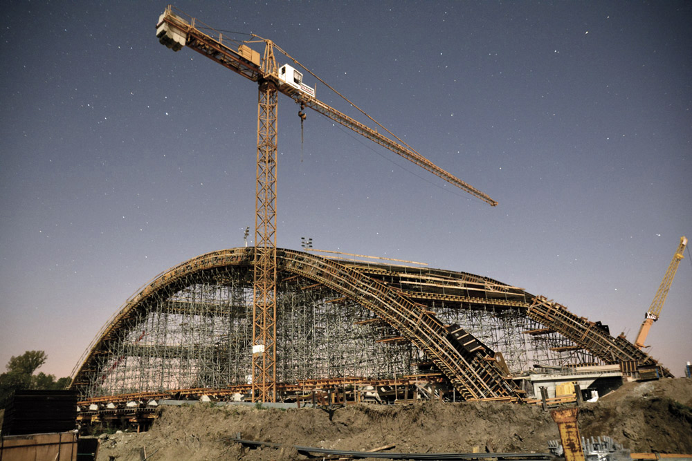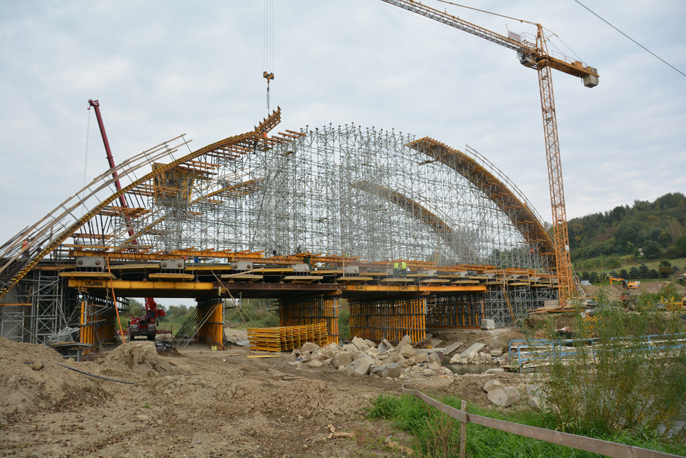 Los arcos y vigas transversales también se han construido con el encofrado ENKOFORM VMK, ya que ofrece gran resistencia y versatilidad. La curvatura del tablero fenólico, se ha logrado mediante camones. Y para dar forma al arco, se han utilizado los tensores E sobre riostras y conectores MK en la parte más pronunciada. La curva de la parte central del arco, menos acentuada, se ha obtenido por la simple regulación de los husillos del sistema de apeo.
