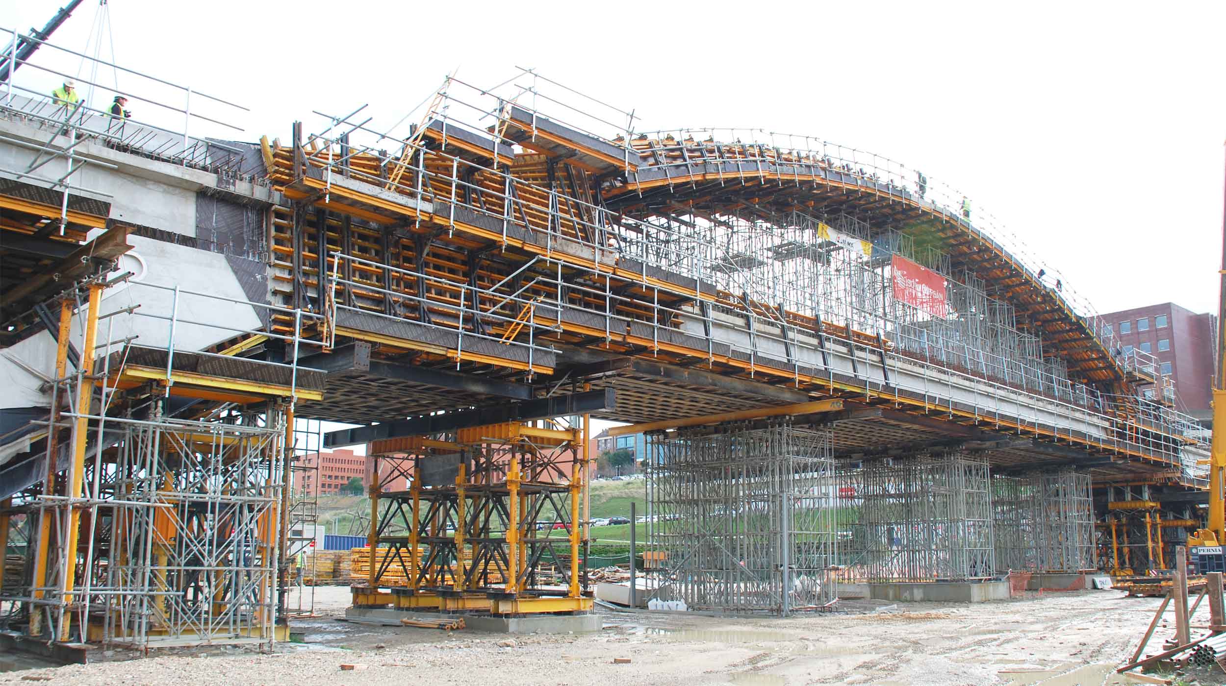 La geometría variable del puente se ejecutó con el encofrado horizontal ENKOFORM HMK. Su flexibilidad le permite acometer todo tipo de formas y presiones de hormigón.