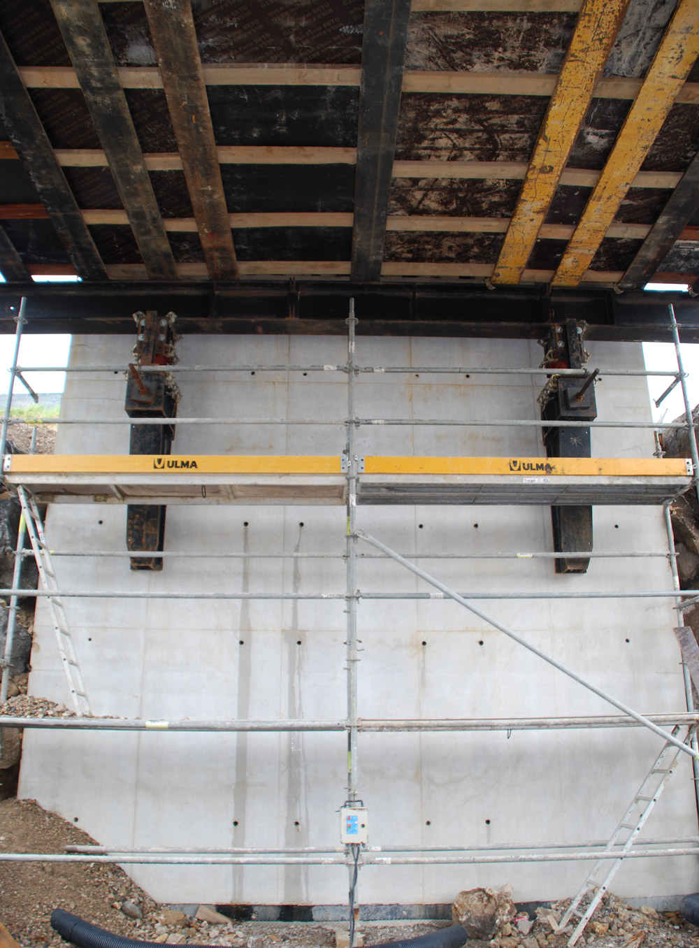 Las zonas más ligeras se apearon con la Cimbra T-60, y las más pesadas con la cimbra T-500. En la zona de estribos, el encofrado se apoyó sobre Martillos MT. Dichos estribos se ejecutaron con el encofrado vertical ORMA.