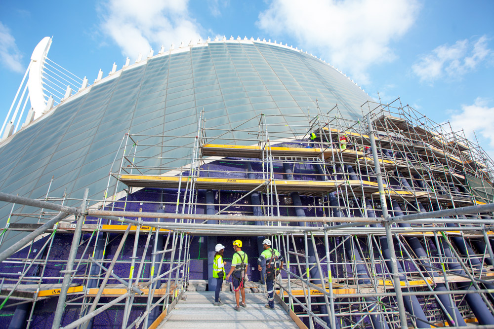 Solución: Andamio perimetral BRIO con voladizos de hasta 3 m. Perfecta adaptación y ajuste a los tensores estructurales, así como flexibilidad del andamio a los continuos cambios de inclinación.