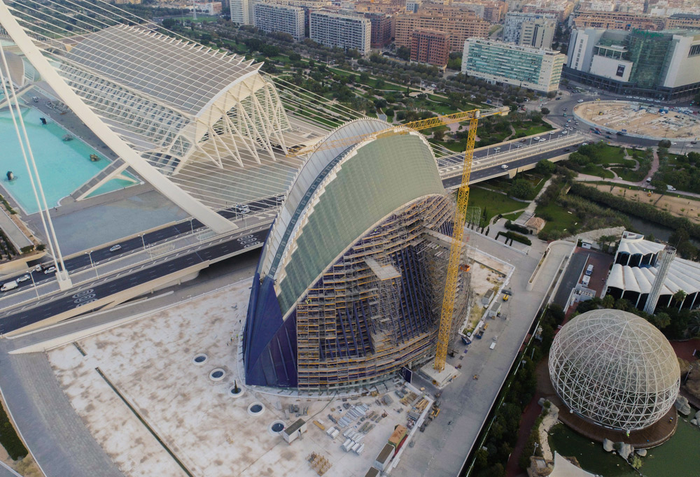 Diseñado por el arquitecto e ingeniero Santiago Calatrava, el elemento más característico del edificio es su cubierta móvil o “brise-soleil”, formada por 163 lamas metálicas, de 31 m de longitud en zona centro, y hasta los 15 m de las lamas extremas.