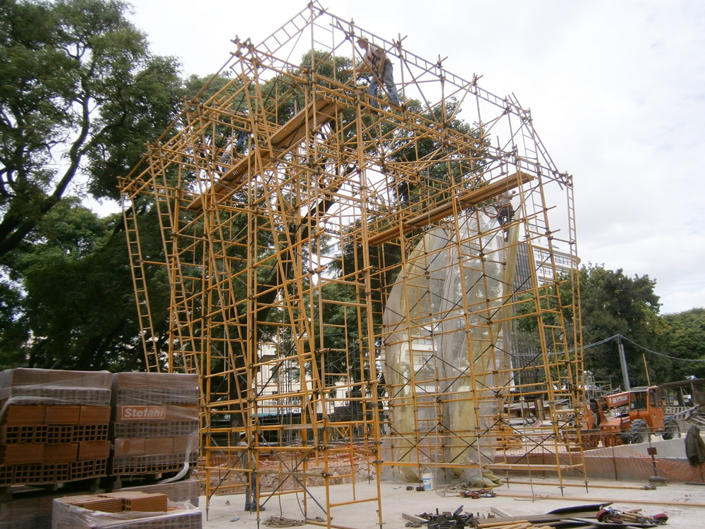 - SALÓN DE LOS ESCUDOS: La solución aportada consistió en un Andamio de fachada para el tratamiento de distintos sectores a restaurar, con un desarrollo total de 23 metros y 20 metros de altura. La complejidad fue la rigidización del conjunto, ya que no era posible fijarlo a la estructura que en gran parte ya había sido reparada. Por lo tanto se recurrió a un andamio auxiliar con el sólo fin de servir como anclaje de arriostramientos. Se incluyó una escalera interior de Andamio para acceso de los operarios y seis torres móviles.