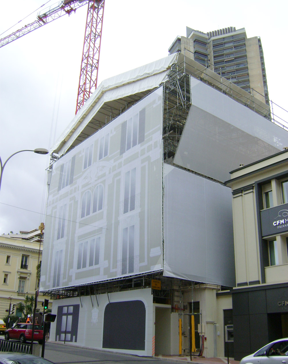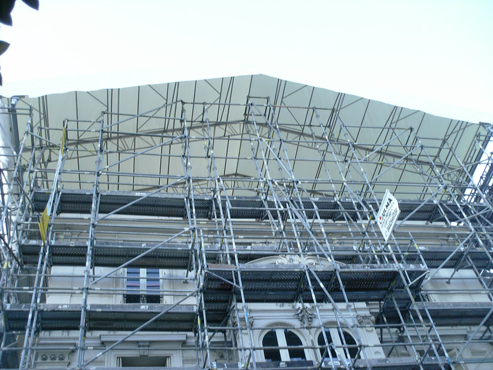 Ante las numerosas operaciones con grúa para suministrar material durante todo el proceso, ULMA optó por dos cubiertas temporales rodantes que permiten la apertura y cierre de la cubierta. Además de esta cubierta, la versatilidad del Andamio Multidireccional BRIO posibilitó el revestimiento total del edificio, salvando su compleja geometría. Se crearon plataformas de trabajo a diferentes niveles y se permitió el paso seguro de peatones por la vía pública.