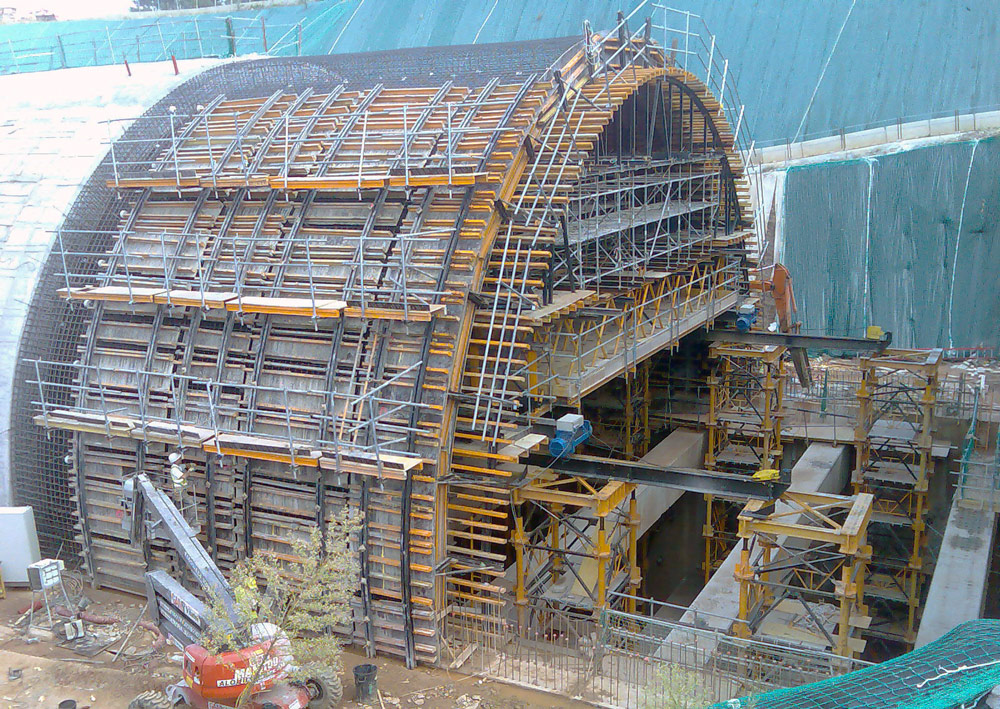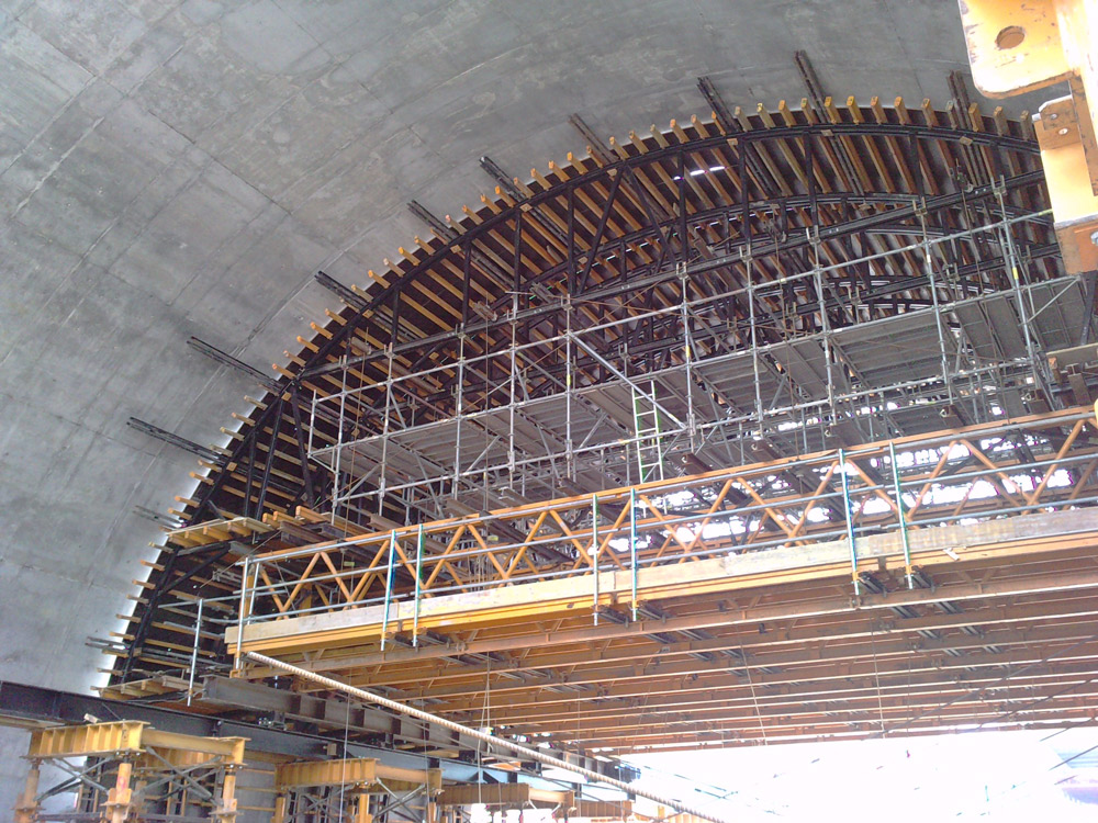 Los trabajos se realizaron a 17 metros de altura, ya que en el piso inferior circula el metro y las losas intermedias tienen un espesor reducido. Al no poder emplear el sistema de cimbra cuajada, se planteó una compleja solución técnica: a partir de un carro porta-encofrado en altura, y apoyado en Cimbra T-500, Estructuras H-33, BRIO y riostras curvas, se salvaron refuerzos transversales de hormigón cada 5,2 m.