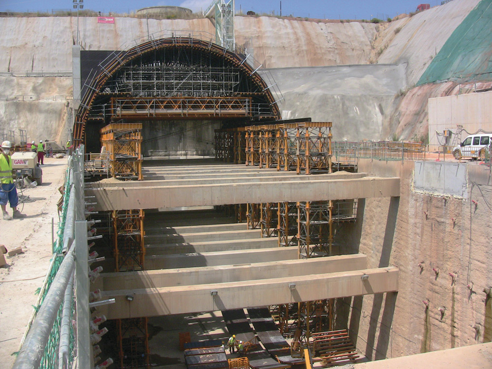 El carro, de 14 m de longitud y 22 m de diámetro de bóveda, cubrió una longitud de 130 m en tongadas sucesivas de 12,35 m.