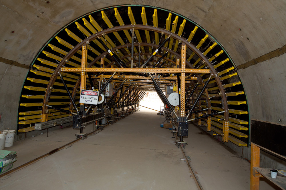 Su sistema hidráulico permitió un suave desencofrado, y sus motores de accionamiento eléctrico trasladaron los carros a una velocidad de 6,2 m/minuto. El diámetro interno de los túneles fue de 6,5 m, con espesores de tabique variable de entre 37,5 cm (parte más alta) y 70 cm en la parte baja de los hastiales.