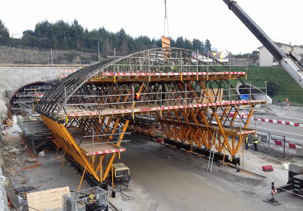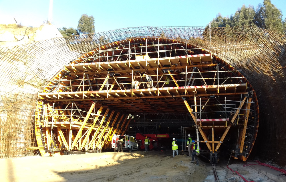 Y por último un sistema de carro de encofrado MK para permitir el hormigonado del túnel. Con un mismo carro es posible realizar distintas geometrías en un mismo túnel; de ahí que se haya empleado en este caso ya que consta de cuatro secciones tipo en las que varía el fondo de la sección. Además, está solución ha contemplado el paso de vehículos, necesario en este tipo de proyectos.