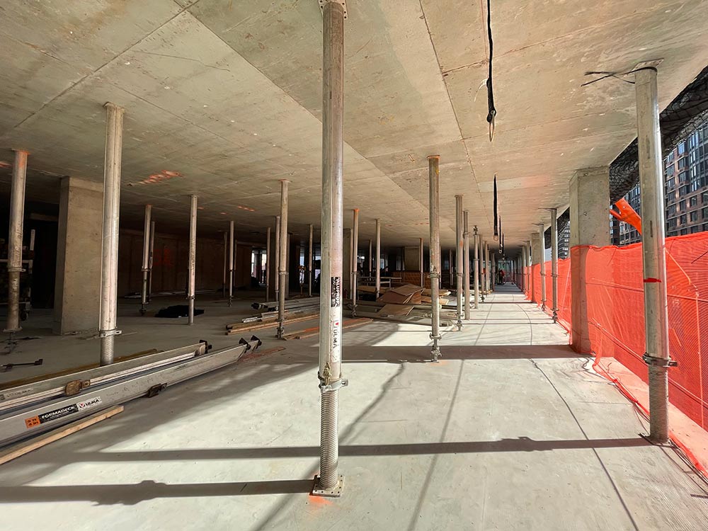 FORMADECK proporciona un método rápido y eficaz para encofrar grandes superficies, y ENKOFLEX ofrece versatilidad. Con estos dos sistemas es posible solucionar de forma segura y eficiente casi cualquier situación. En este caso el apeo mínimo era de 2,9 m y el máximo 4,9 m.