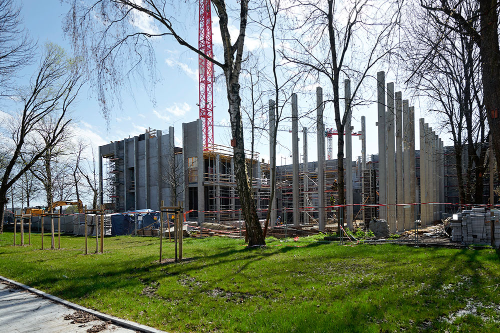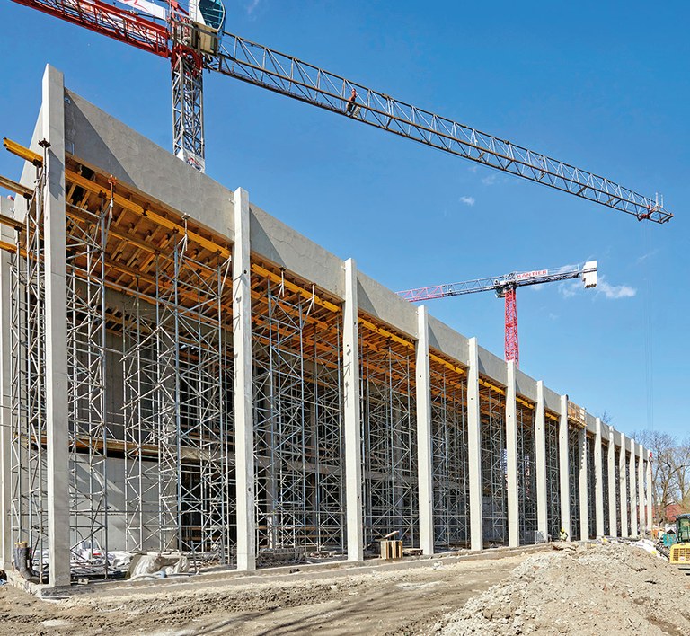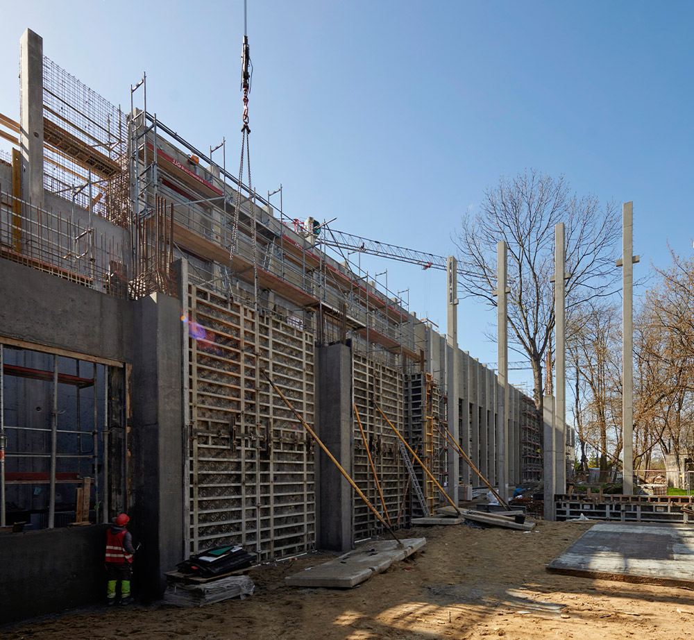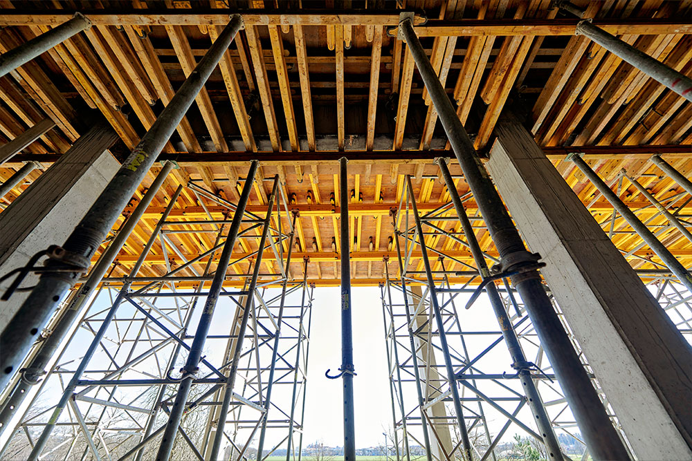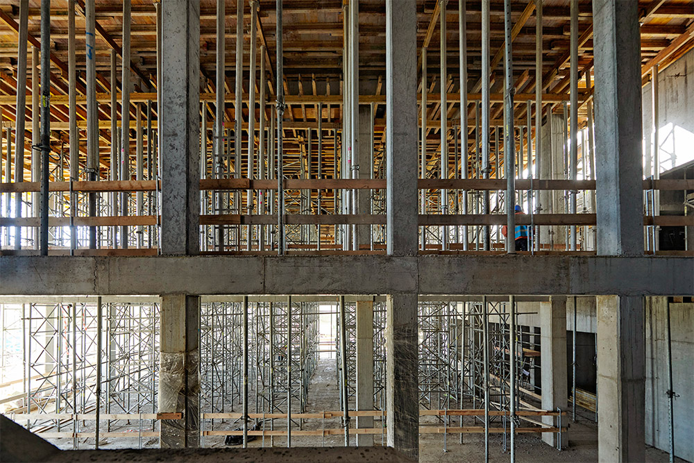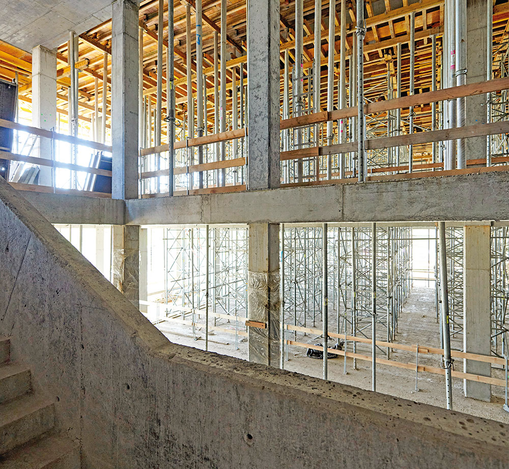 Los tabiques y columnas se han llevado a cabo con el sistema de encofrado modular ORMA, que equipado con plataformas de trabajo ha garantizado eficiencia y seguridad. Además, para incrementar la protección de los trabajadores, se ha instalado un sistema de escaleras y plataformas F4. En caso de las columnas de sección circular, que alcanzaban los 6 m de altura, se han utilizado encofrados circulares de acero CLR.