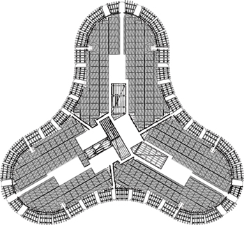 De los 1.600 m2 de cada losa típica, 1.100 m2 de 25 cm de espesor se han realizado con encofrado de aluminio CC-4. ENKOFLEX ha sido el complemento ideal para la zona perimetral ya que al estar compuesto por vigas independientes se adapta a las formas curvas de este edificio. De 190 m lineales, un canto de 0,90 m y 2,50 m de ancho, se remata con tabicas especiales. Ambos sistemas se apean con puntal europeo EP.