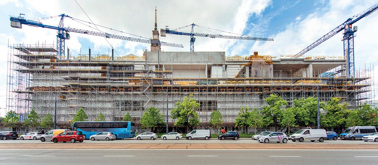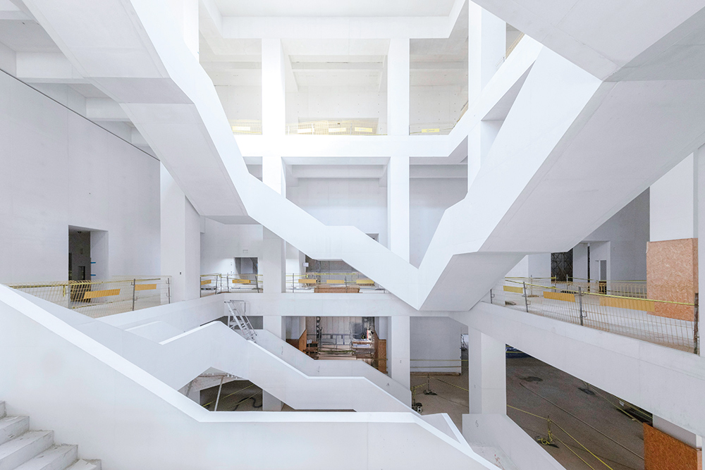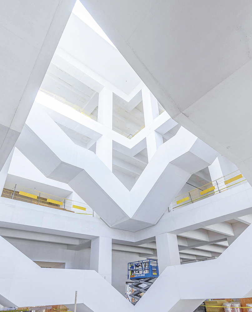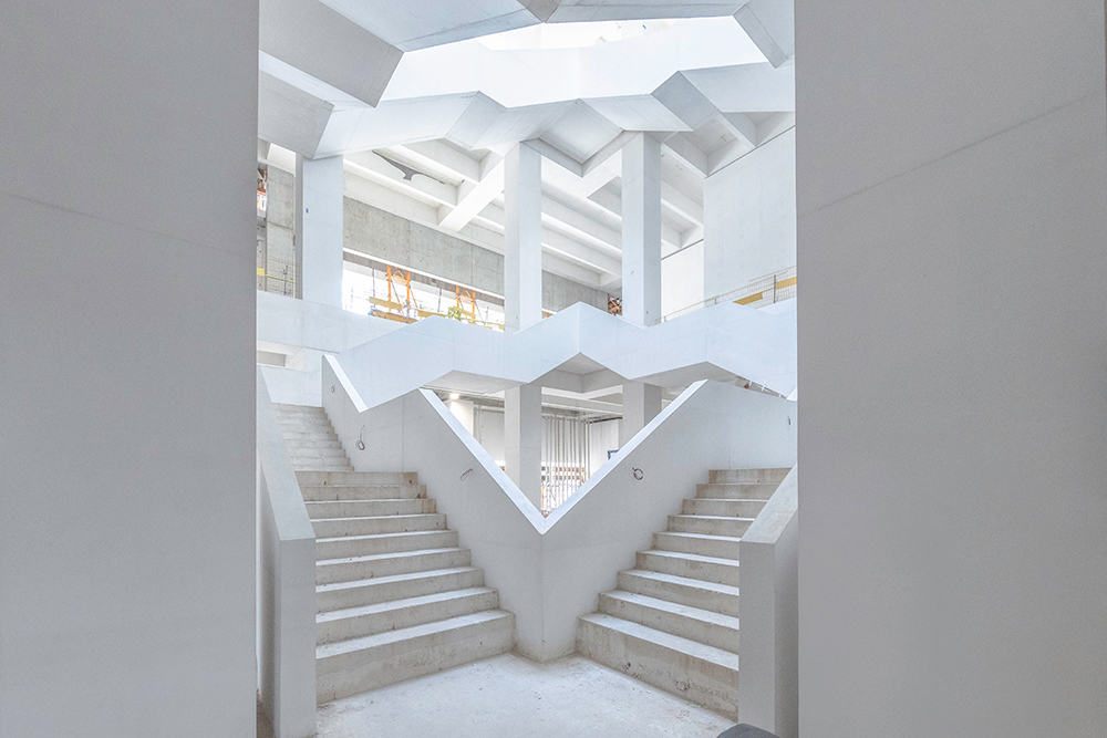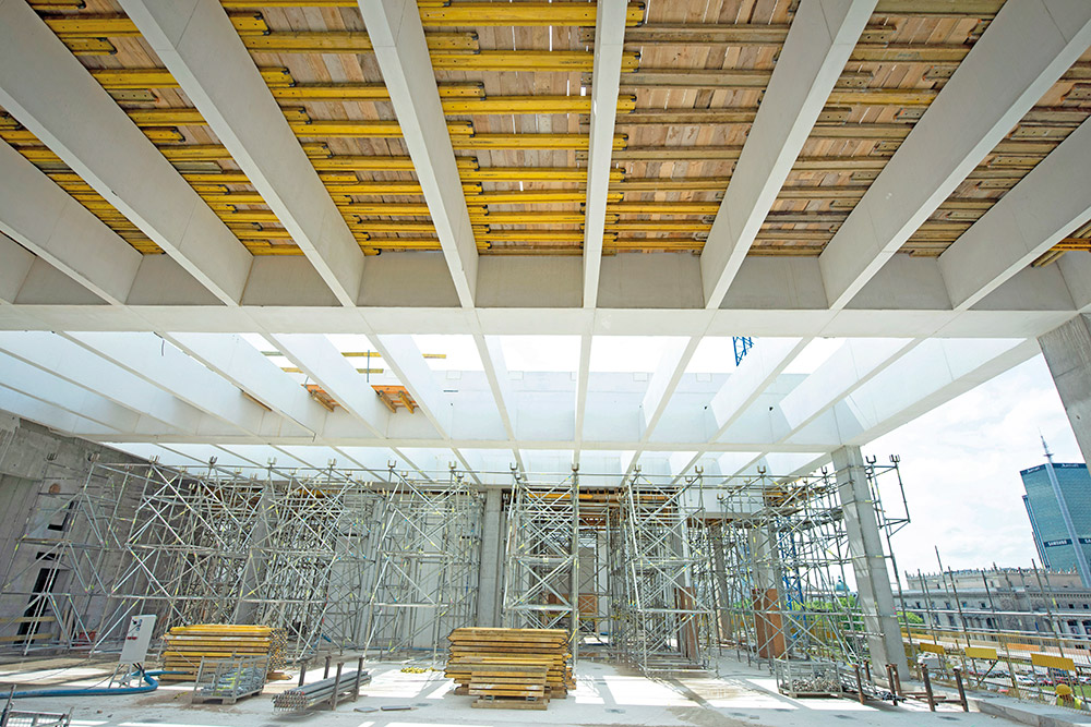 Los tabiques de hormigón blanco visto combinan a la perfección con los espacios interiores mientras que el volumen del edificio se integra en el entorno cultural de la ciudad. El equipo de ingeniería de ULMA Polonia ha trabajado de forma continua en los estudios y en la aplicación de encofrados y andamios para asegurar la máxima calidad de las superficies de hormigón. Además de los conocimientos técnicos y la experiencia, ULMA ha aportado su capacidad logística que, dada la gran envergadura del proyecto y su complejidad, debían garantizar las entregas de equipos de acuerdo a un estricto cronograma y, sobre todo, hacer posible el suministro a la obra de estructuras de encofrado ya premontadas.