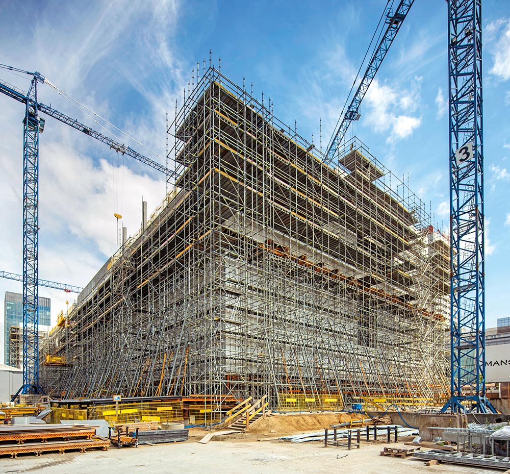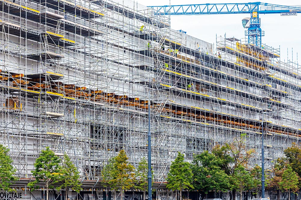Al mismo tiempo, en el perímetro del edificio, se ha instalado un andamio de 25 m de altura para garantizar la seguridad de los trabajos y habilitar un espacio de apoyo de los encofrados exteriores. Ante la imposibilidad de fijar el andamio a la fachada, se ha diseñado un sistema especial de anclajes aprovechando los orificios de las barras roscadas. Esta solución ha mejorado la estabilidad del andamio durante la operación de descenso de la fachada.