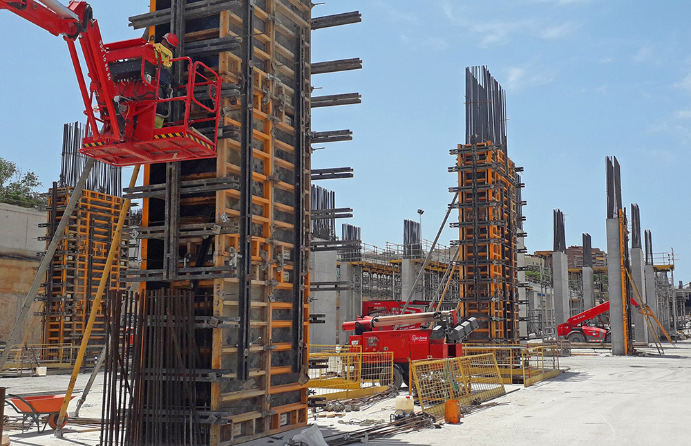 En la losa de cimentación de 36.000 m² y una altura de 4 m se ha empleado la combinación del encofrado ORMA y el sistema de cerchas a una cara UCAB-EUC.