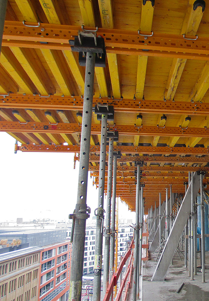 Las losas con inclinaciones de 18° a 30° se han encofrado con el sistema de vigas ENKOFLEX fácilmente adaptable a las distintas geometrías de losa. En la zona perimetral, se han empleado Mesas MK que se han desplazado de una puesta a otra con el Elevador VR. El perímetro del edificio ha estado cubierto en todo momento por barandillas tanto las losas encofradas como las ejecutadas.