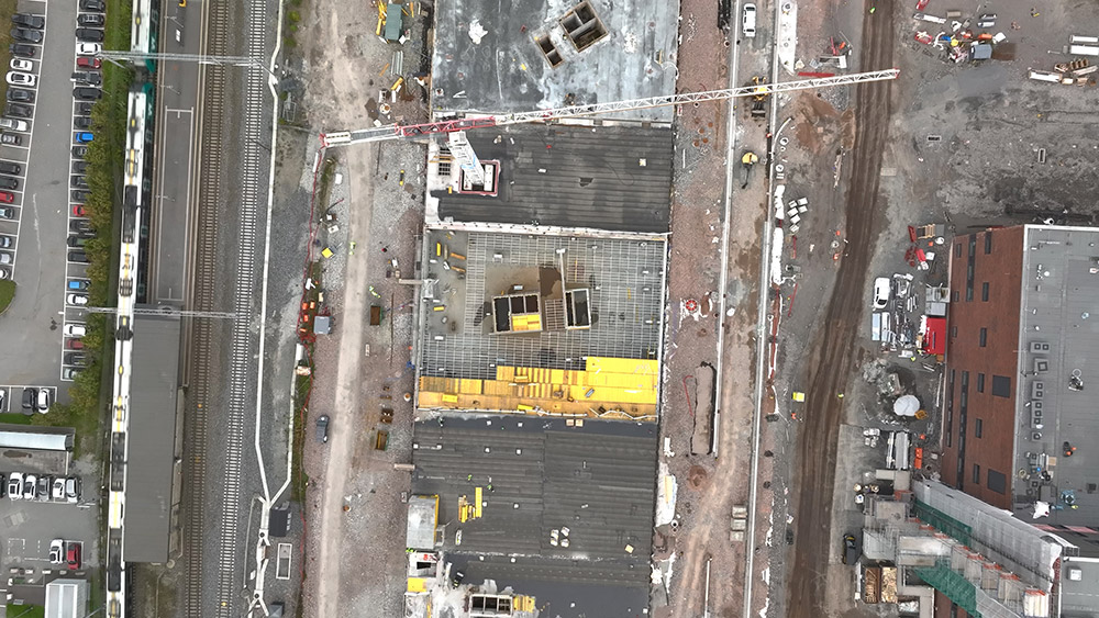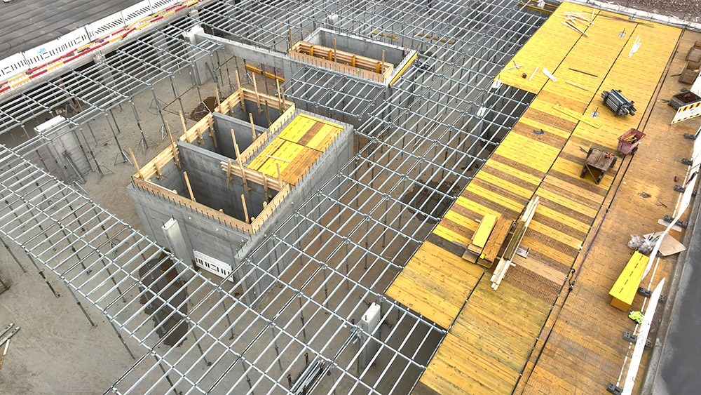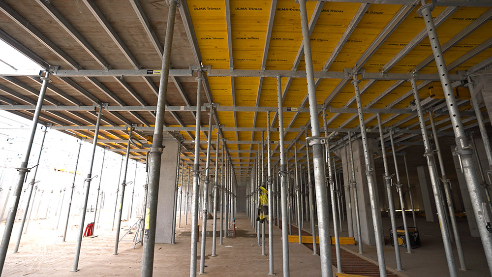 Para la ejecución de la losa postensada, de 35 cm de espesor, se ha optado por dividir los trabajos en fases de aproximadamente 1.000 m². En estas superficies, ULMA ha suministrado encofrado recuperable ONADEK, en combinación con puntales EP y vigas de madera para los remates. La elección de ONADEK ha permitido abordar con eficacia los requisitos de geometría, flexibilidad y carga propios de este tipo de losas. Su diseño modular, unido a su facilidad de montaje y desencofrado, ha contribuido a mantener un alto rendimiento en obra.
