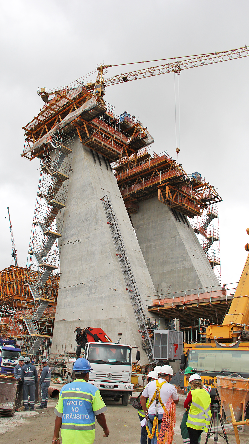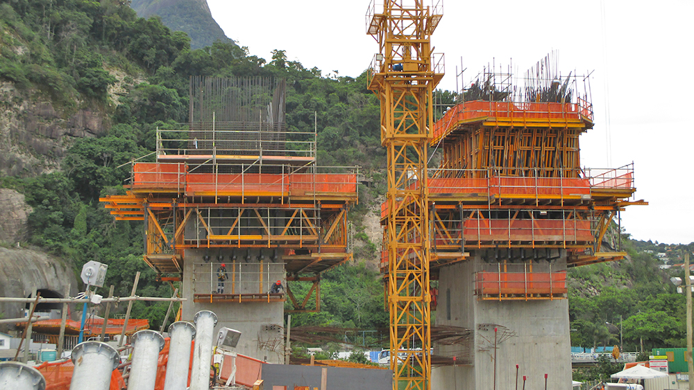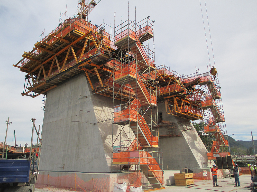 El sistema ATR era el idóneo, por su agilidad y productividad, dada la geometría del pilono ya que cada una de las pilas tenía una inclinación diferente, 25 y 21 grados respectivamente. La solución que ha planteado el equipo de ingeniería de ULMA ha consistido en incorporar a las consolas de autotrepado de las caras inclinadas cerchas MK y sobre ellas, apoyadas otro par de cerchas en las otras dos caras laterales. Así las 4 cerchas han creado un anillo alrededor del pilono, con plataformas de trabajo que se han elevado a través de los equipos hidráulicos ubicados en las consolas trepantes. El diseño de esta estructura ha permitido adaptarse a la sección cambiante de la pila en cada tongada sin la necesidad de desmontaje.